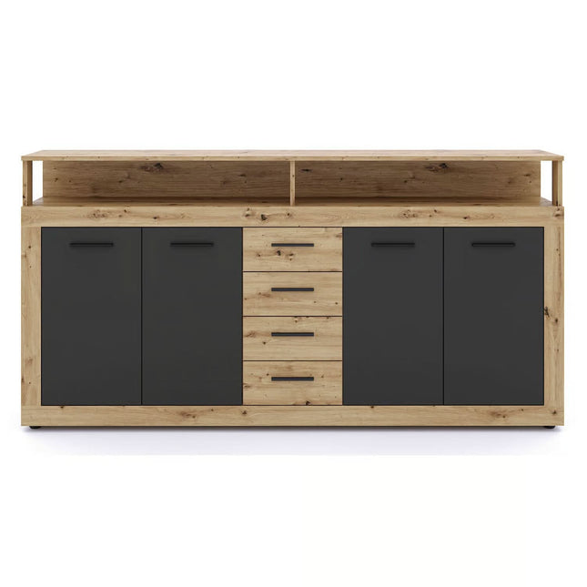 Mebel Elite BLAGO keturių durų komoda 190 cm, šviesus ąžuolas / juoda, modernaus lofto stilius