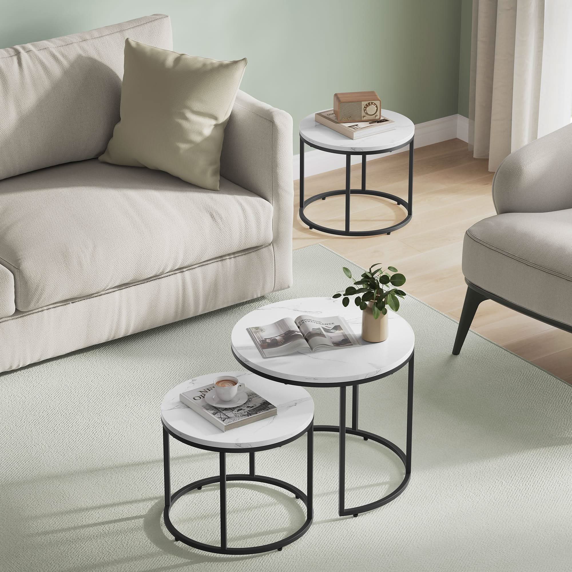 Apvalių kavos staliukų rinkinys, marmurinės spavos/juodos kojos, 2 vnt.