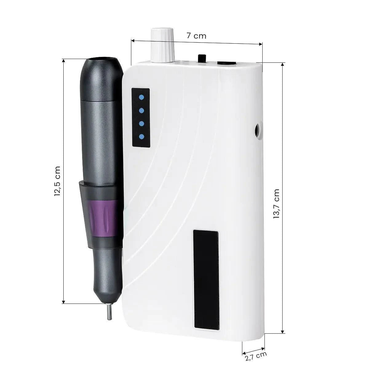 Nagų freza yra nedidelė, o jos minimalistinis plastikinis baltų atspalvių korpusas leidžia lengvai išlaikyti prietaisą švarų. Dėl kompaktiškų matmenų ir nedidelio svorio prietaisą lengva laikyti mažose erdvėse ir patogu transportuoti, o tai ypač svarbu žmonėms, teikiantiems mobiliąsias paslaugas. Korpuso gale yra spaustukas, kuriuo galima patogiai pritvirtinti prietaisą prie diržo ar kitos vietos.