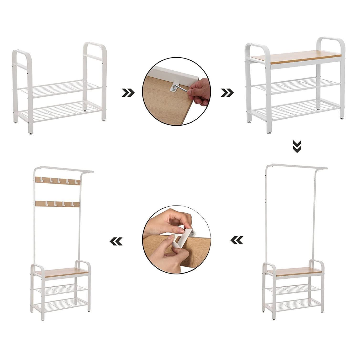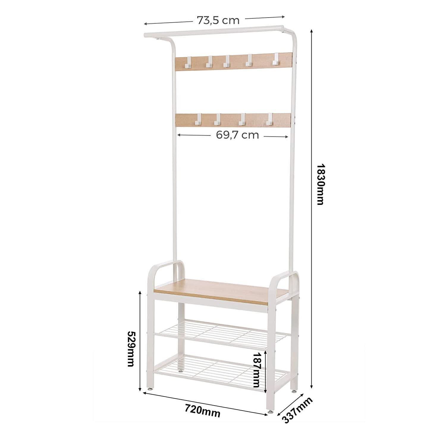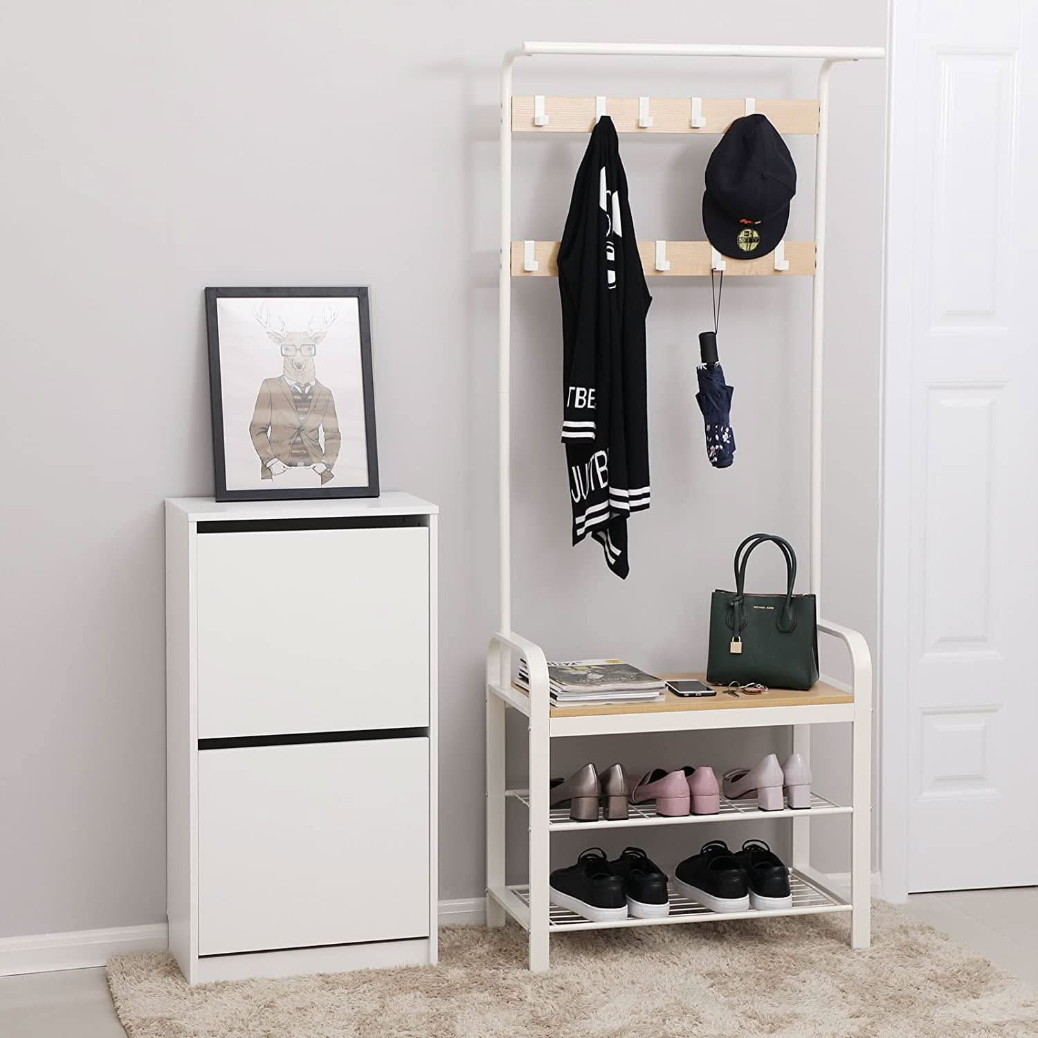 Po pakaba yra dvi patvarios ir erdvios batų lentynos, kurios padės sutvarkyti batus namuose, ir sėdynė, leidžianti efektyviai juos apsiauti. Gaminys puikiai tiks bet kurioje salėje ar koridoriuje. Geležinė konstrukcija užtikrina baldo stabilumą.