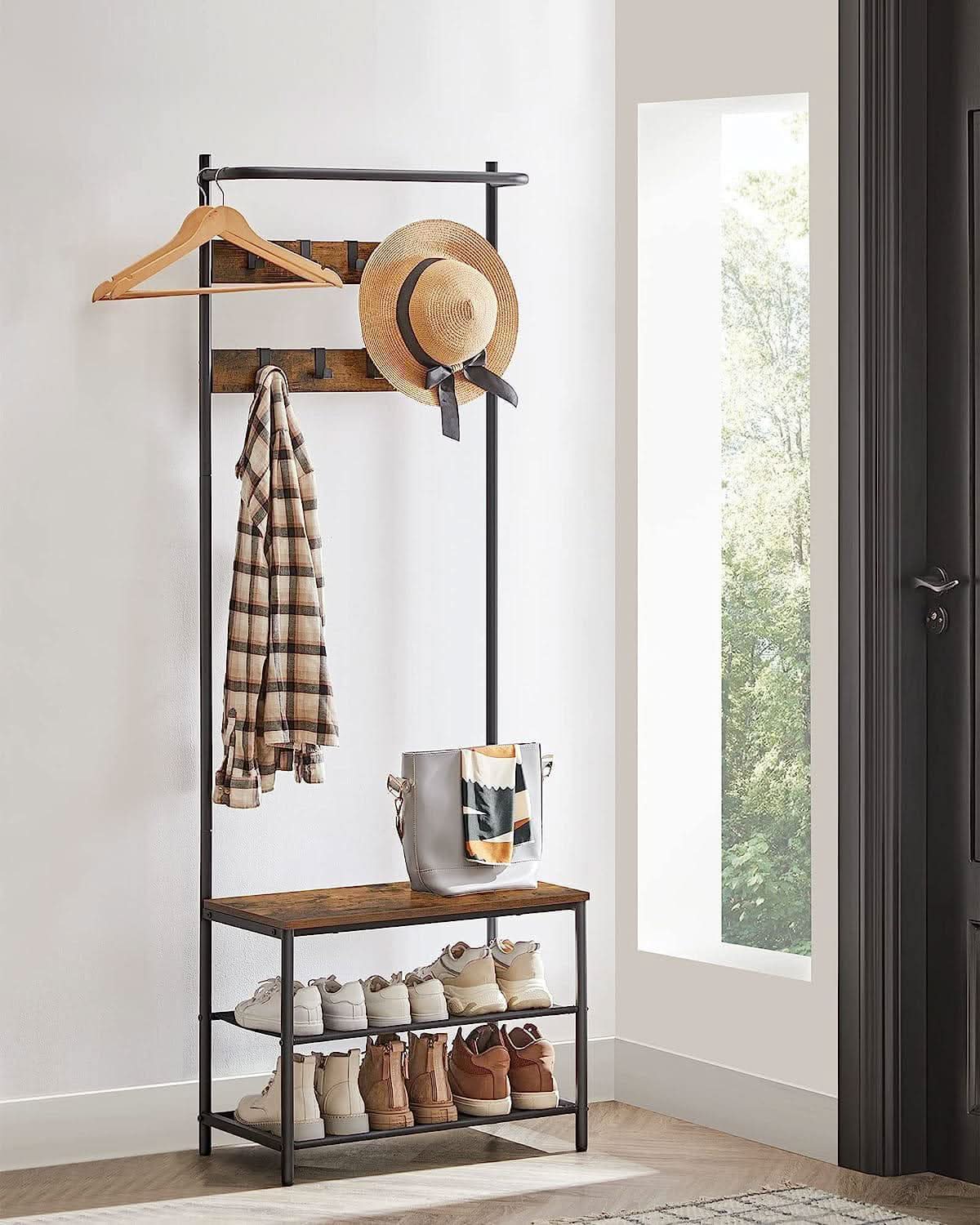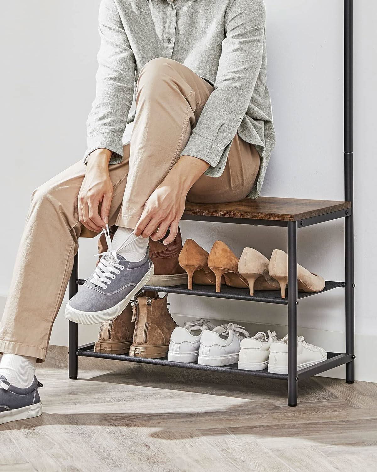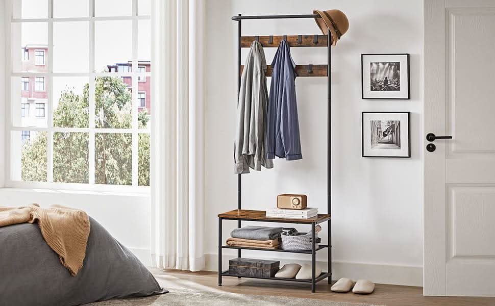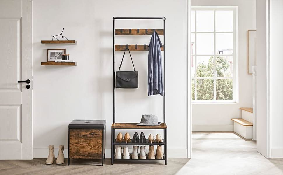 Po pakaba yra 2 patvarios ir erdvios batų lentynos, kurios padės sutvarkyti batus jūsų namuose bei sėdynė, kuri leis juos efektyviai apsiauti. Gaminys puikiai tiks bet kurioje salėje ar koridoriuje tiek namuose, tiek biure. Plieninė konstrukcija užtikrina baldo stabilumą. Puikiai prigludę lentynų elementai ir rudos spalvos sėdynės rėmas suteiks žavesio jūsų interjerui.