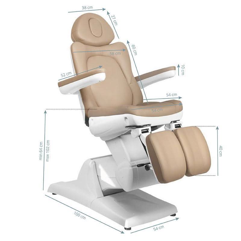 Moderni elektra reguliuojama pedikiūro kėdė, užtikrinanti komfortą procedūros metu ne tik pacientams, bet ir procedūrą atliekantiems asmenims. Tylūs elektros varikliai greitam ir patogiam sėdynės reguliavimui. Kėdė turi kontūruotą ir labai patogią sėdynę, jie yra patvarūs ir labai stabilūs. Dėl paaukštintų porankių klientui lengviau užimti vietą ant kėdės. Platus aukštyn-žemyn elektrinio reguliavimo diapazonas leidžia individualiai reguliuoti kėdės aukštį pagal procedūrą atliekančio asmens ūgį ir procedūros tipą.