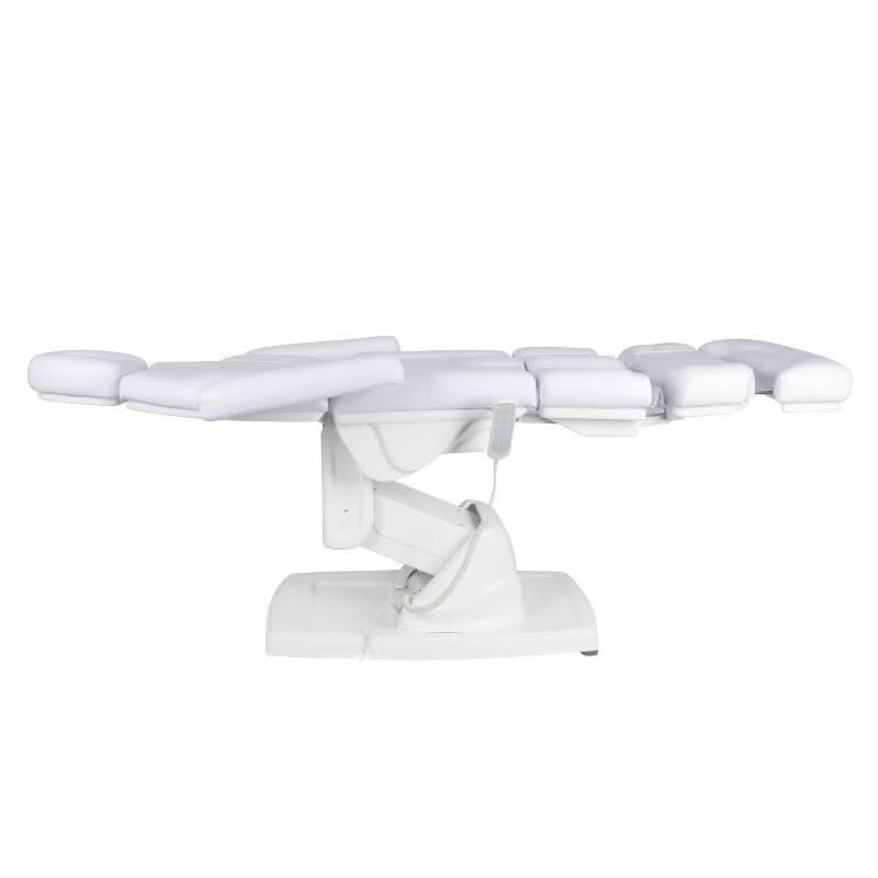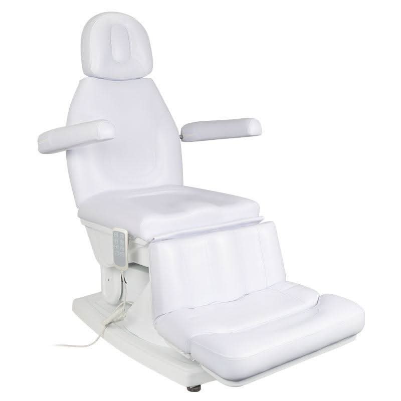 Modernus dizainas ir funkcionalumas viename. Moderni elektra reguliuojama kosmetinė kėdė, užtikrinanti komfortą ne tik klientams, bet ir procedūrą atliekantiems asmenims. 4 tyliai veikiantys elektriniai varikliai leidžia greitai ir patogiai reguliuoti kėdę nuotolinio valdymo pulteliu. Pasirinktinai galima prijungti kojinį jungiklį (kodas 133026). Kėdė turi kontūrinę ir labai patogią sėdynę, yra patvarios ir labai stabilios konstrukcijos. Speciali kojų atramos konstrukcija palengvina pedikiūro ir podiatrijos procedūras. Reguliavimo aukštyn-žemyn diapazonas, leidžiantis individualiai pritaikyti kėdės aukštį prie procedūrą atliekančio asmens ūgio ir procedūros tipo.