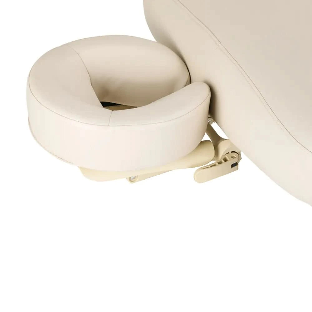 Ergonomiškas galvos atlošas su veido anga, įtrauktas į komplektą, užtikrina patogią galvos padėtį atliekant procedūras gulint ant nugaros, pilvo ar visiškai horizontaliai. Tinkama atrama padidina kliento komfortą net ir ilgesnių procedūrų metu bei padeda visiškai atsipalaiduoti. Elementas turi reguliuojamą pasvirimo kampą dviem plokštumomis, todėl galima tiksliai pritaikyti padėtį pagal procedūros tipą ir individualius poreikius.