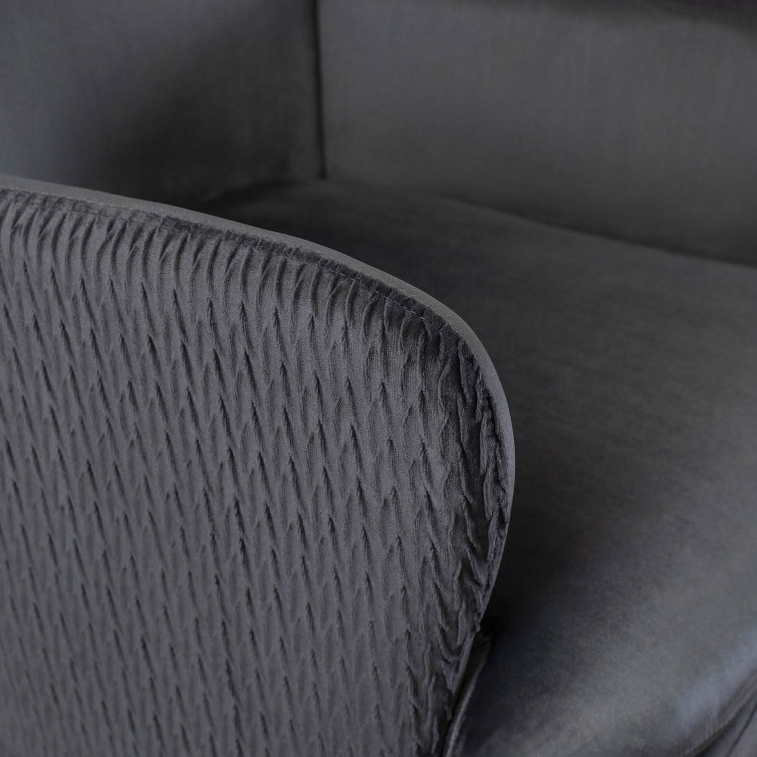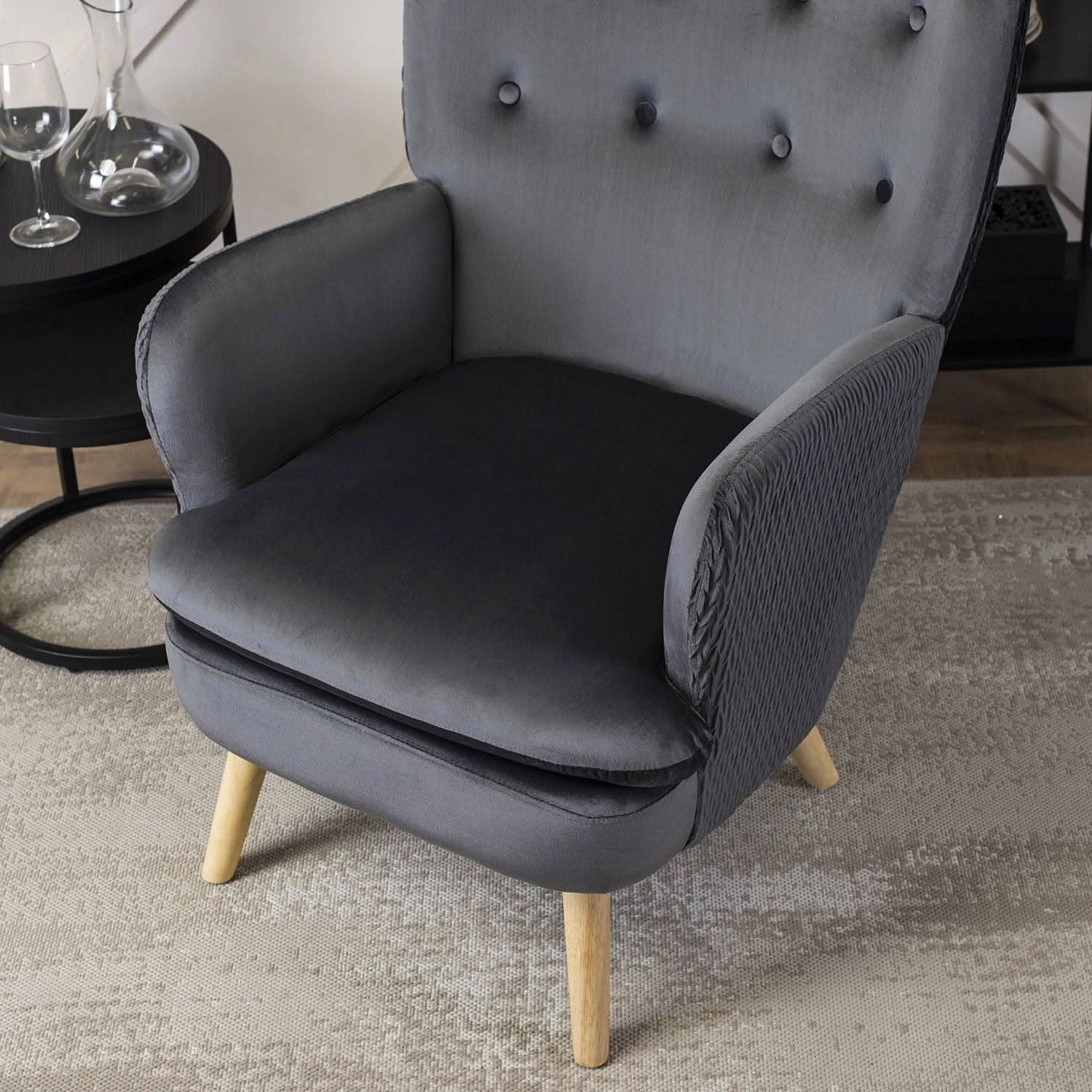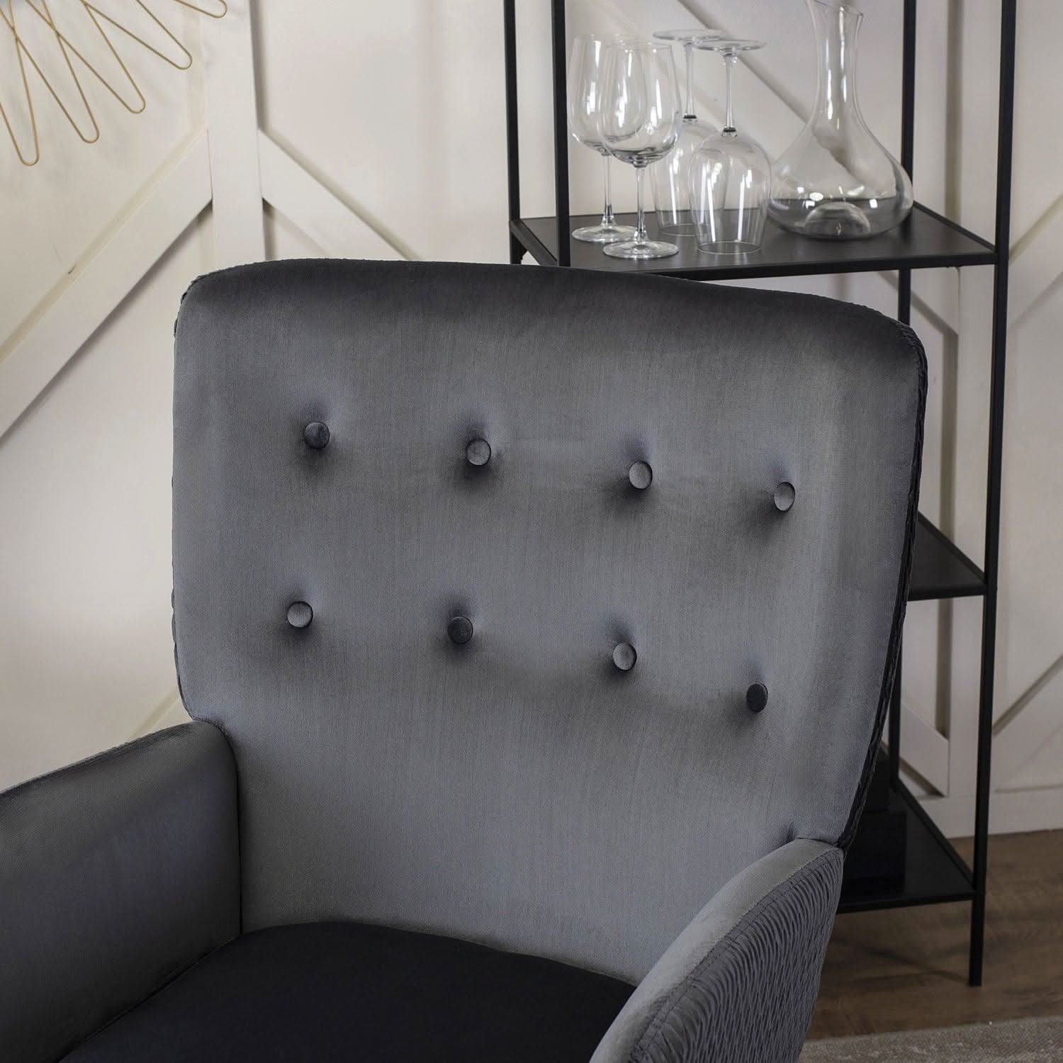 Fotelis dengtas malonia aksomine medžiaga, kuri ne tik atrodo elegantiškai, bet ir yra atspari dėvėjimuisi. Pilkas aksomas gražiai dera su audinio klostėmis ir subtiliomis sagutėmis, kurios papildo fotelio išvaizdą rafinuotais akcentais.