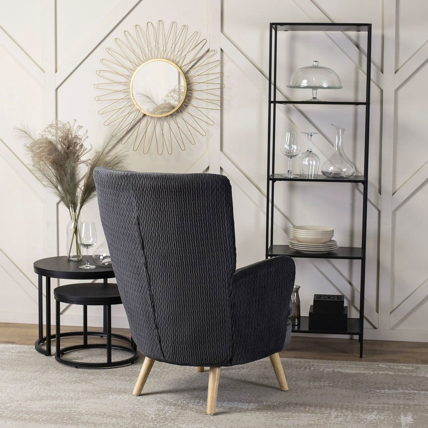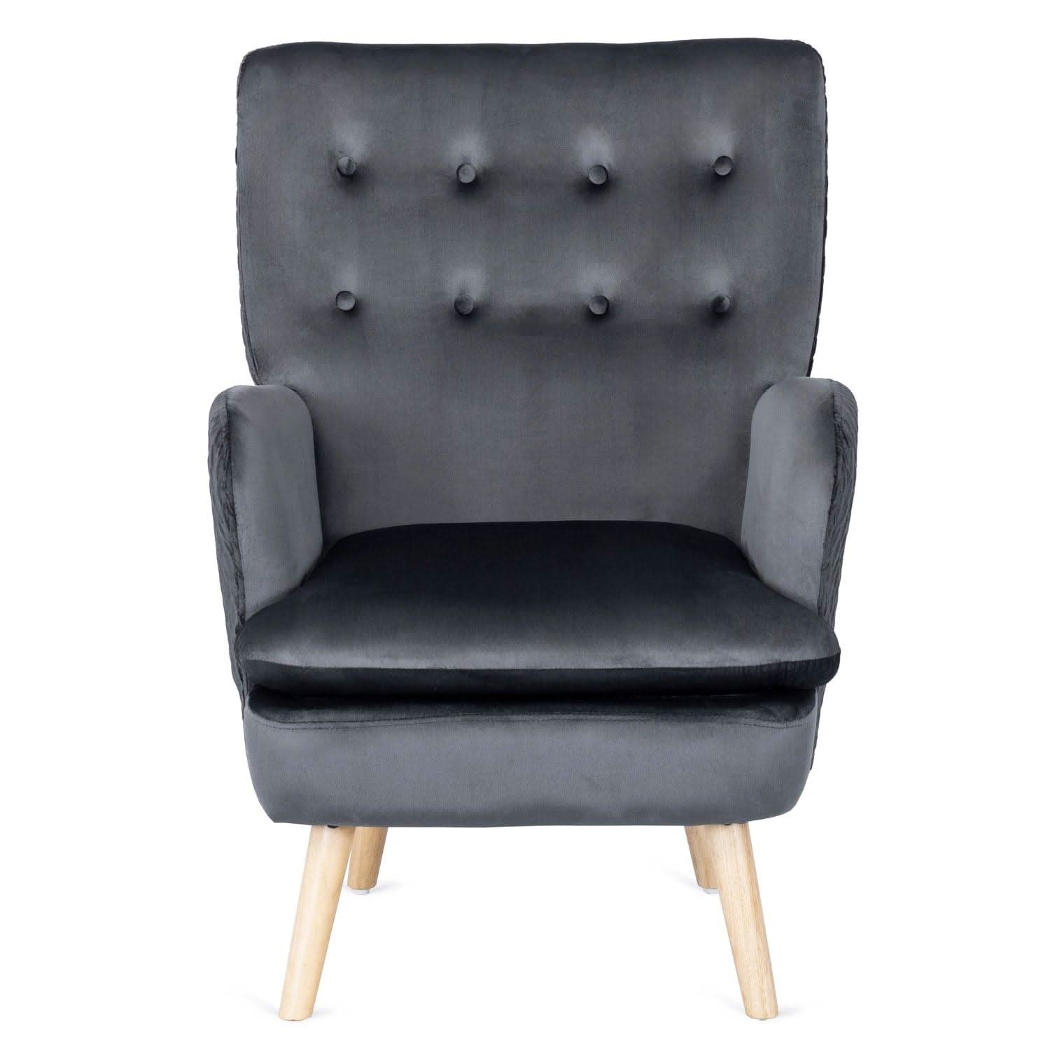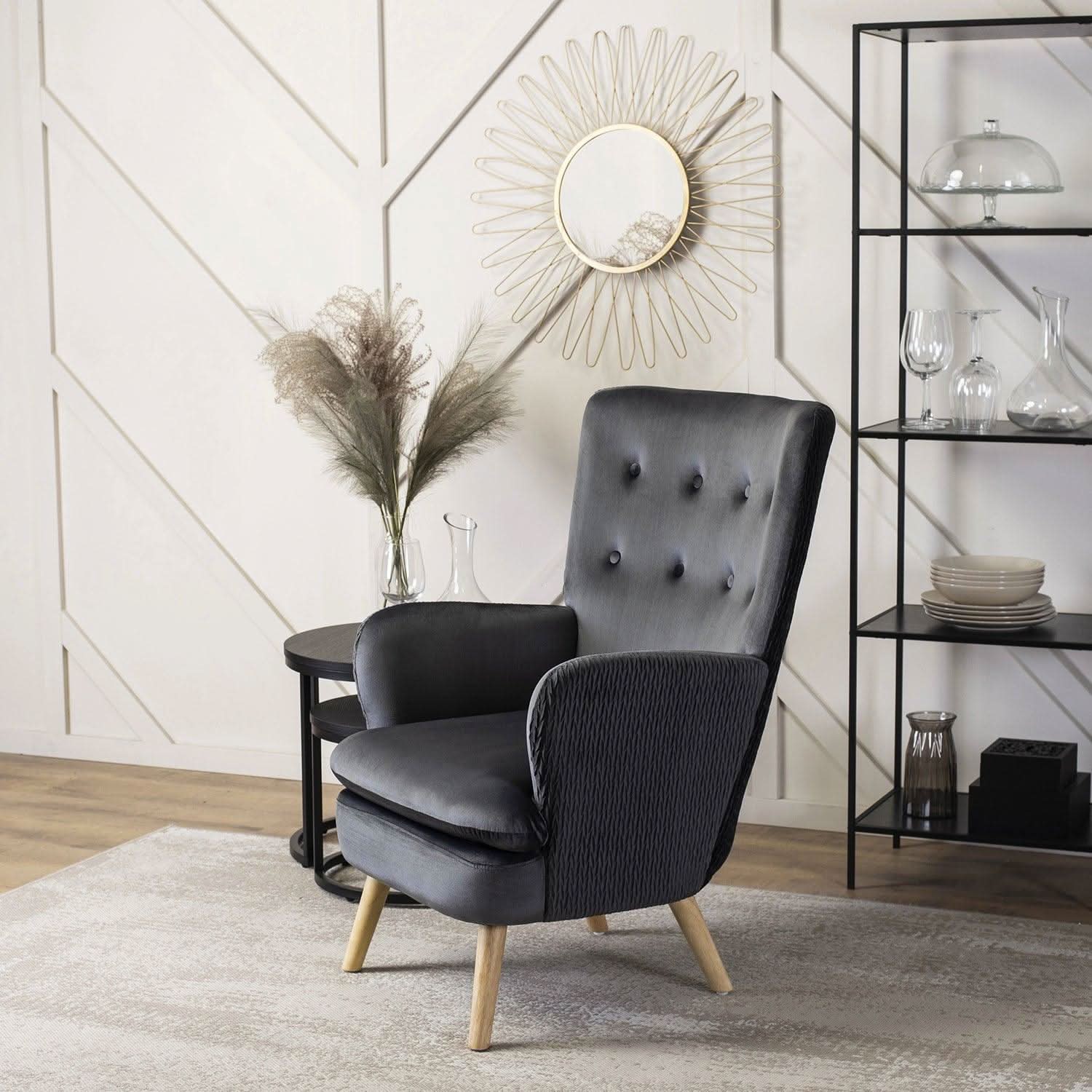 Fotelis dengtas malonia aksomine medžiaga, kuri ne tik atrodo elegantiškai, bet ir yra atspari dėvėjimuisi. Pilkas aksomas gražiai dera su audinio klostėmis ir subtiliomis sagutėmis, kurios papildo fotelio išvaizdą rafinuotais akcentais.