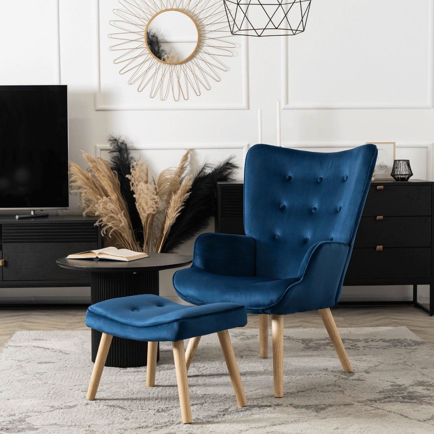 Fotelis su pakoju LOZANO, mėlynas aksomas