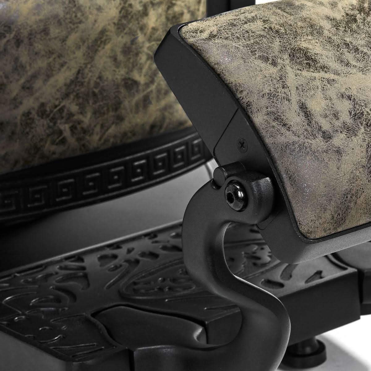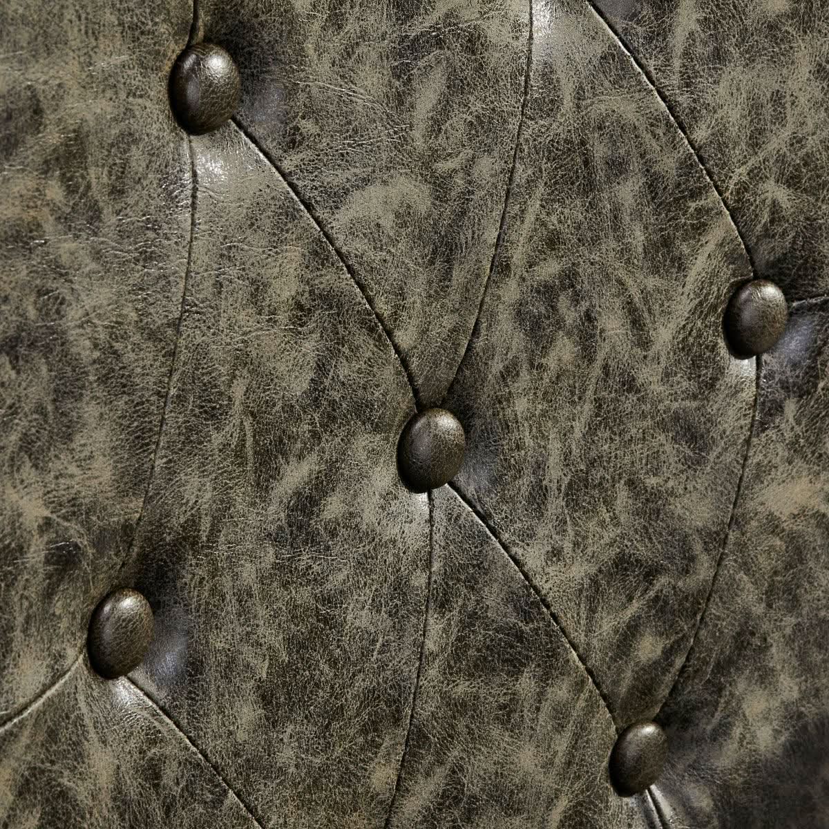 Tvirta bazė užtikrina stabilumą ir didelį naudojimo komfortą. Sėdynės užpildas pagamintas iš patvaraus, deformacijai atsparaus putplasčio, o apmušalai iš malonios liesti sintetinės odos su susidėvėjusia, iš dalies mamine apdaila su sendintu efektu, užtikrinančiu baldo ilgaamžiškumą ir patogų naudojimą. Jie taip pat padaro įrangą atsparią drėgmei, patvarią ir lengvai valomą. Žalia atspalvių danga su skiautine ir dekoratyvinėmis sagomis suteikia jai unikalaus charakterio. Kėdė su būdingu dizainu, atsižvelgiant į vintažinį stilių, puikiai dera prie kirpyklų atmosferos, pabrėžia jų unikalią atmosferą.