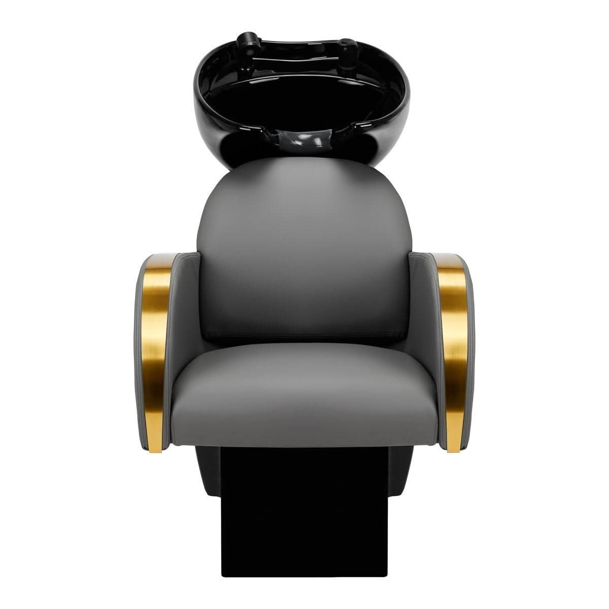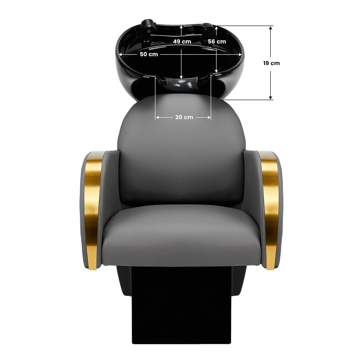 Tinkamai profiliuota kėdė, užpildyta patvariomis putomis, užtikrina didelį naudojimo komfortą ir elegantiški porankiai leidžia tinkamai padėti kliento pečius. Atlošas padėtas optimaliu kampu, kad užimtumėte tinkamą padėtį ir būtų užtikrinta puiki stuburo atrama. Pilkų atspalvių padengimas ir aukso spalvomis lakuoti dekoratyviniai metaliniai paviršiai suteikia jai nesenstančios elegancijos, be to, garantuoja ilgalaikį patvarumą ir lengvą valymą. Dėl išskirtinio klasikinio plautuvės apdailos ji puikiai atrodo beveik bet kurioje erdvėje. Komplekte yra visos pilkos spalvos jungiamosios detalės, įskaitant maišytuvą, dušiuką ir specialias žarnas, kad būtų galima pateikti visą įrankių rinkinį darbui.