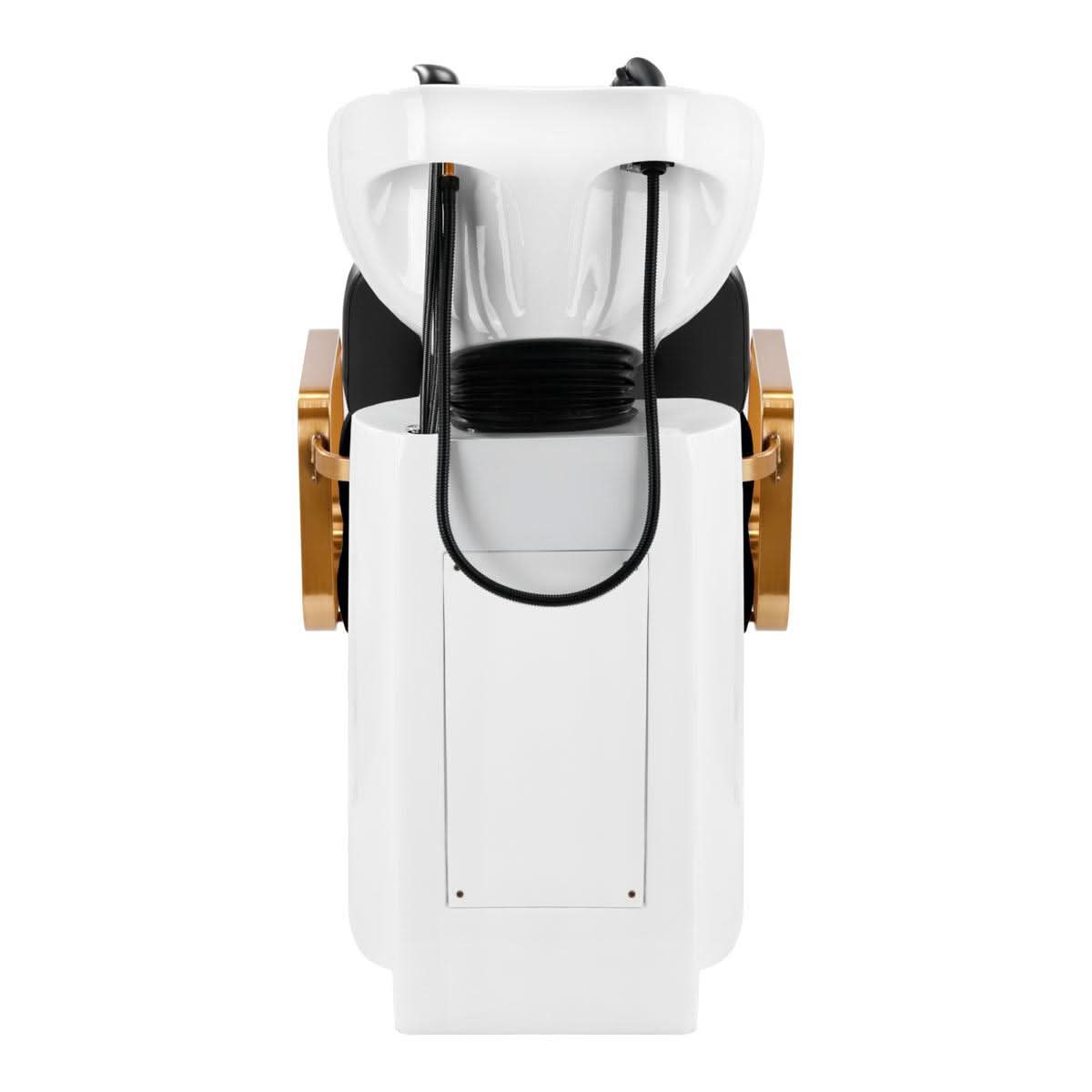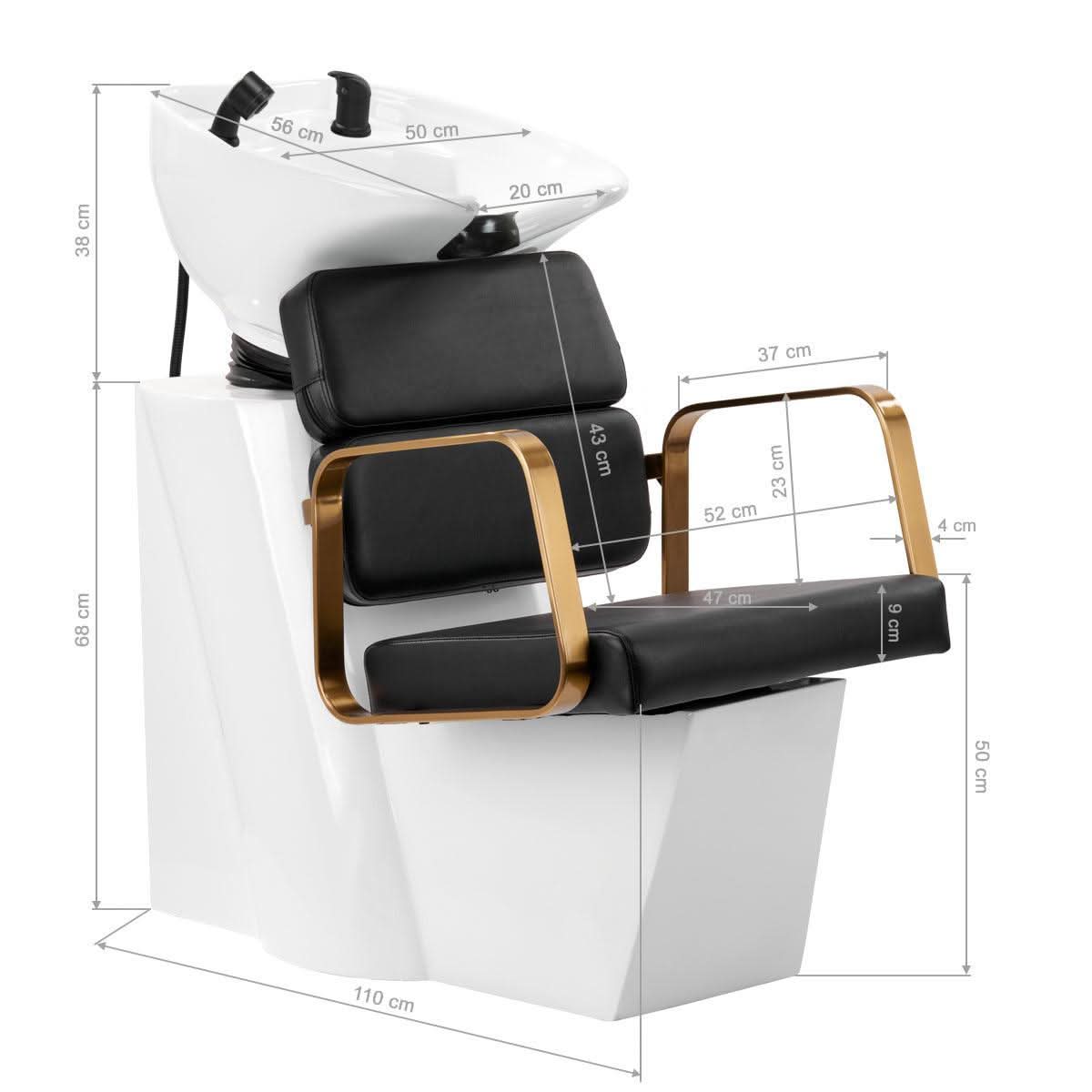 Profiliuota kėdė užtikrina tinkamą juosmens atramą ir , todėl jaučiamas didelis naudojimo komfortas. Metaliniai aukso atspalvių porankiai su geometrine forma leidžia teisingai išdėstyti kliento pečius. Užpildas patvariomis, deformacijoms atspariomis putomis ir apmušalai iš malonaus liesti sintetinės odos juodų atspalvių užtikrina baldo ilgaamžiškumą, lengvą valymą ir patogų naudojimą ilgą laiką. Originali, elegantiška plautuvė įrenginio išvaizdai suteikia interjerui unikalios išraiškos. Rinkinį sudaro visos juodos spalvos detalės, įskaitant maišytuvą, dušoiuką ir specialias žarnas, kad suteiktų visą įrankių rinkinį darbui.