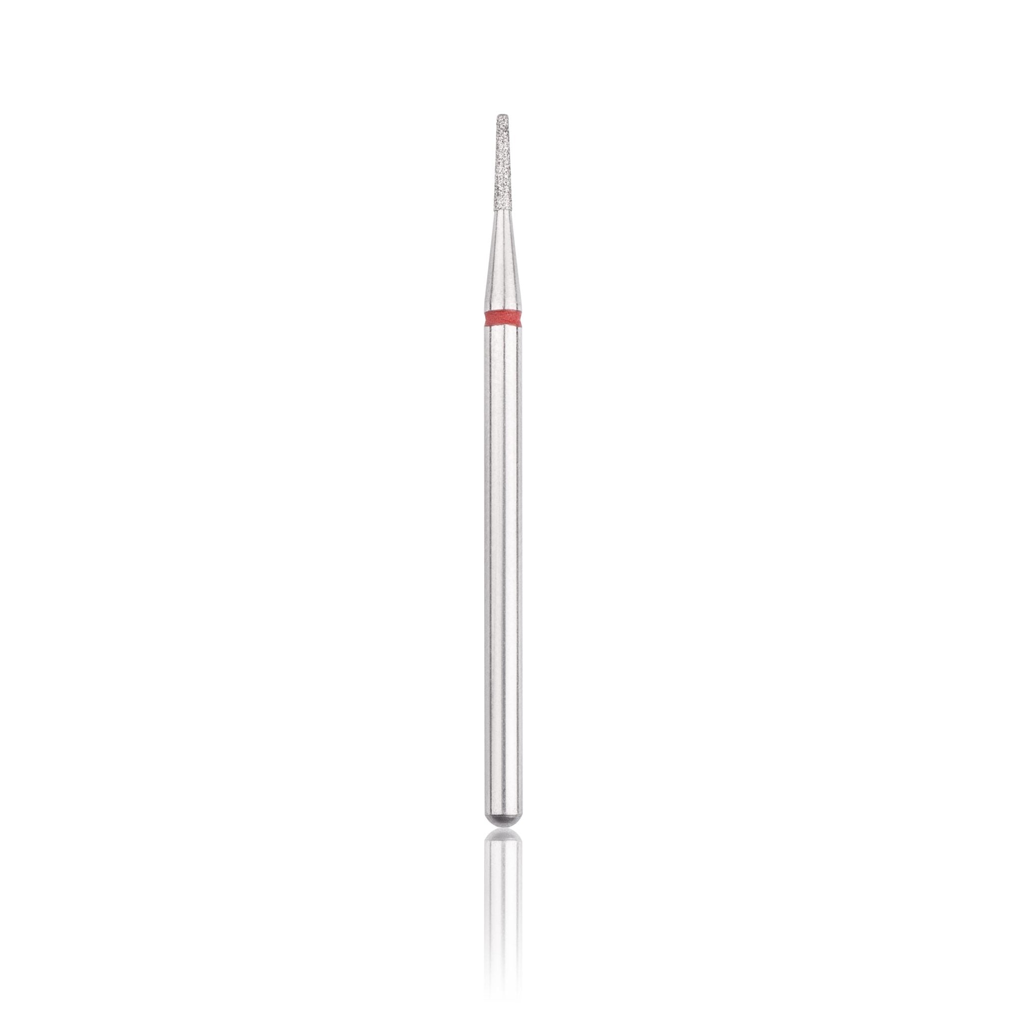 Deimantinis frezos antgalis „frustum“ formos su raudonu žymėjimu – švelnaus abrazyvumo įrankis, skirtas sunkiai pasiekiamų šoninių volelių zonų apdorojimui, suragėjusios odos šalinimui bei tiksliam ir švariam darbui.