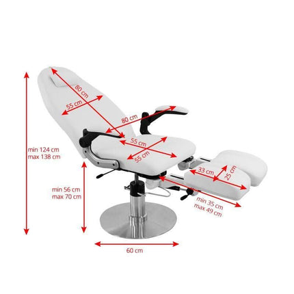 Šiuolaikinė kosmetologinė kėdė. Kėdė yra tvirta ir labai stabili. Dėl paaukštintų porankių klientui lengviau sėdėti ant kėdės. Reguliuojamos kojų atramos leidžia pritaikyti kėdę pagal individualius poreikius. Apmušalai iš aukštos kokybės ekologiškos odos. Modernus dizainas ir funkcionalumas viename.