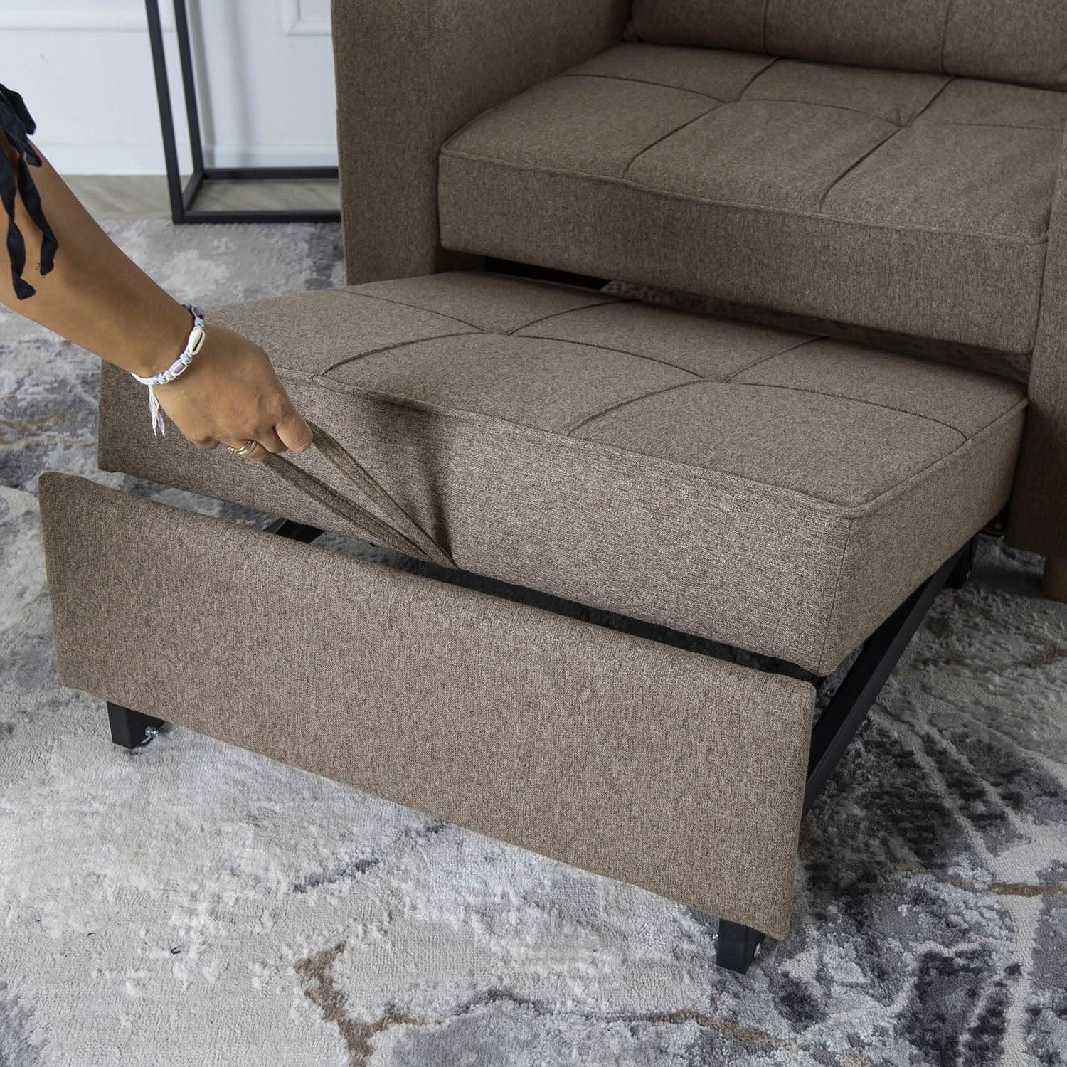 Norėdami išskleisti fotelį, atlikite panašius veiksmus kaip su klasikine sofa. Pasiimkite fotelį nuo apačios ir traukite į save, kad ištiestumėte. Tuomet naudodami medžiaginį rankeną ištraukite viršutinę dalį. Atlošą galima reguliuoti rankiniu būdu keliais kampais.