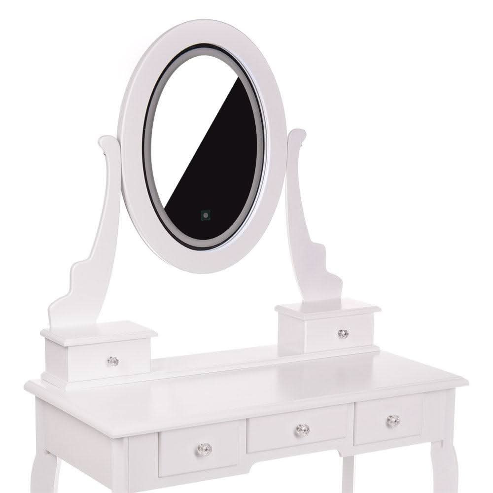 KARI baltas kosmetinis staliukas su LED veidrodžiu, 5 stalčiais + kėdute