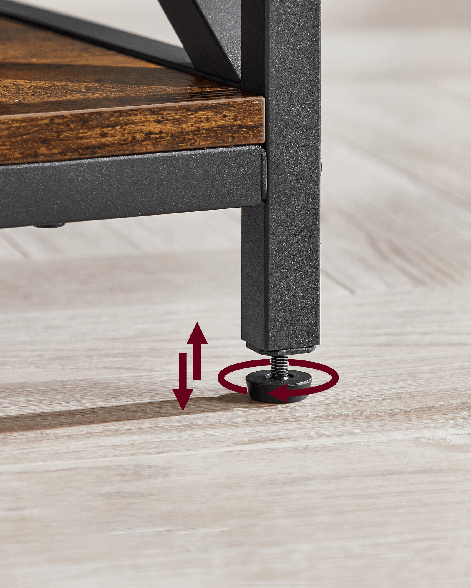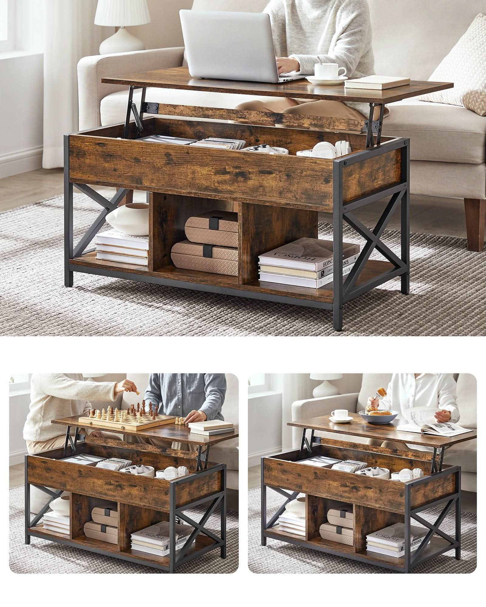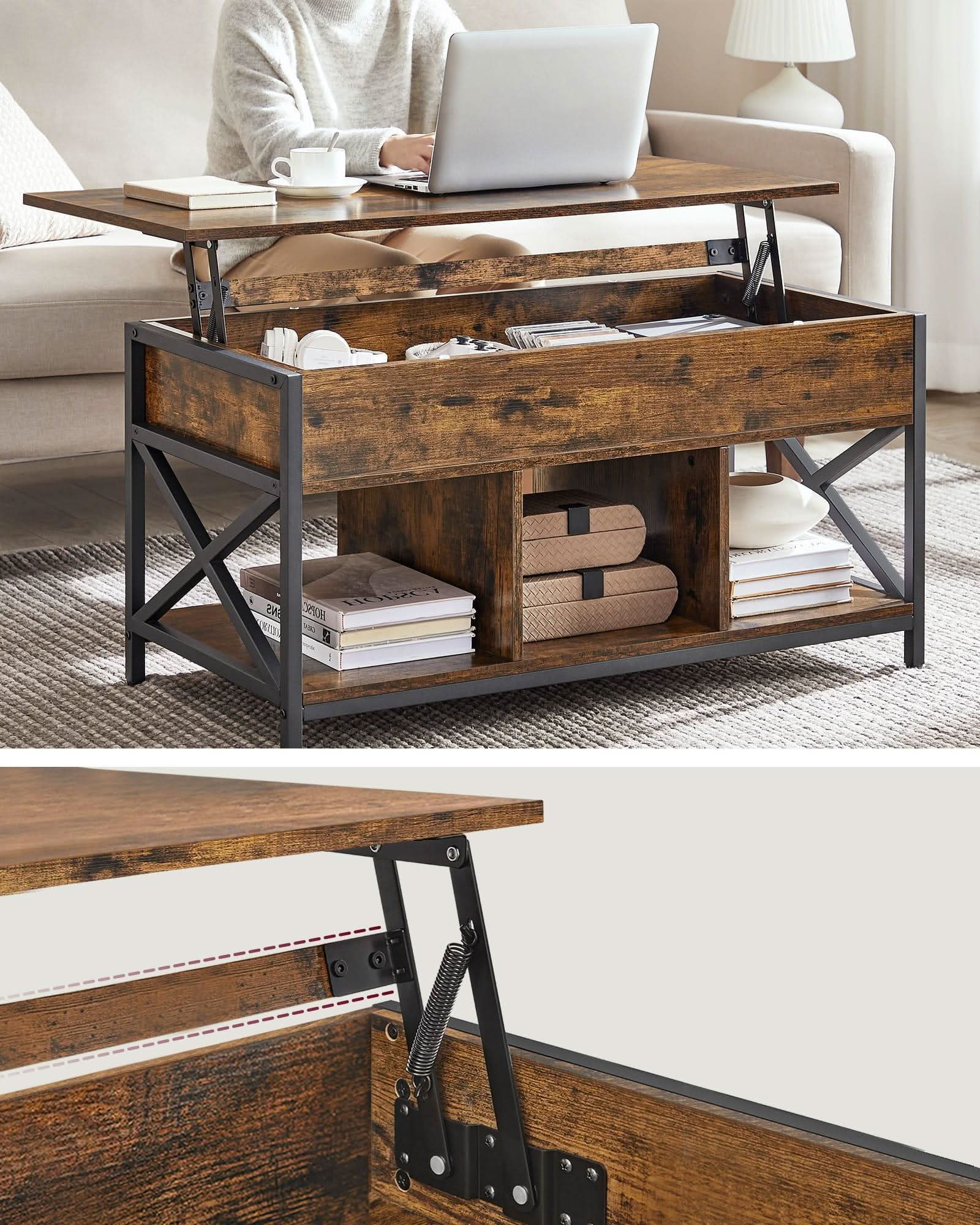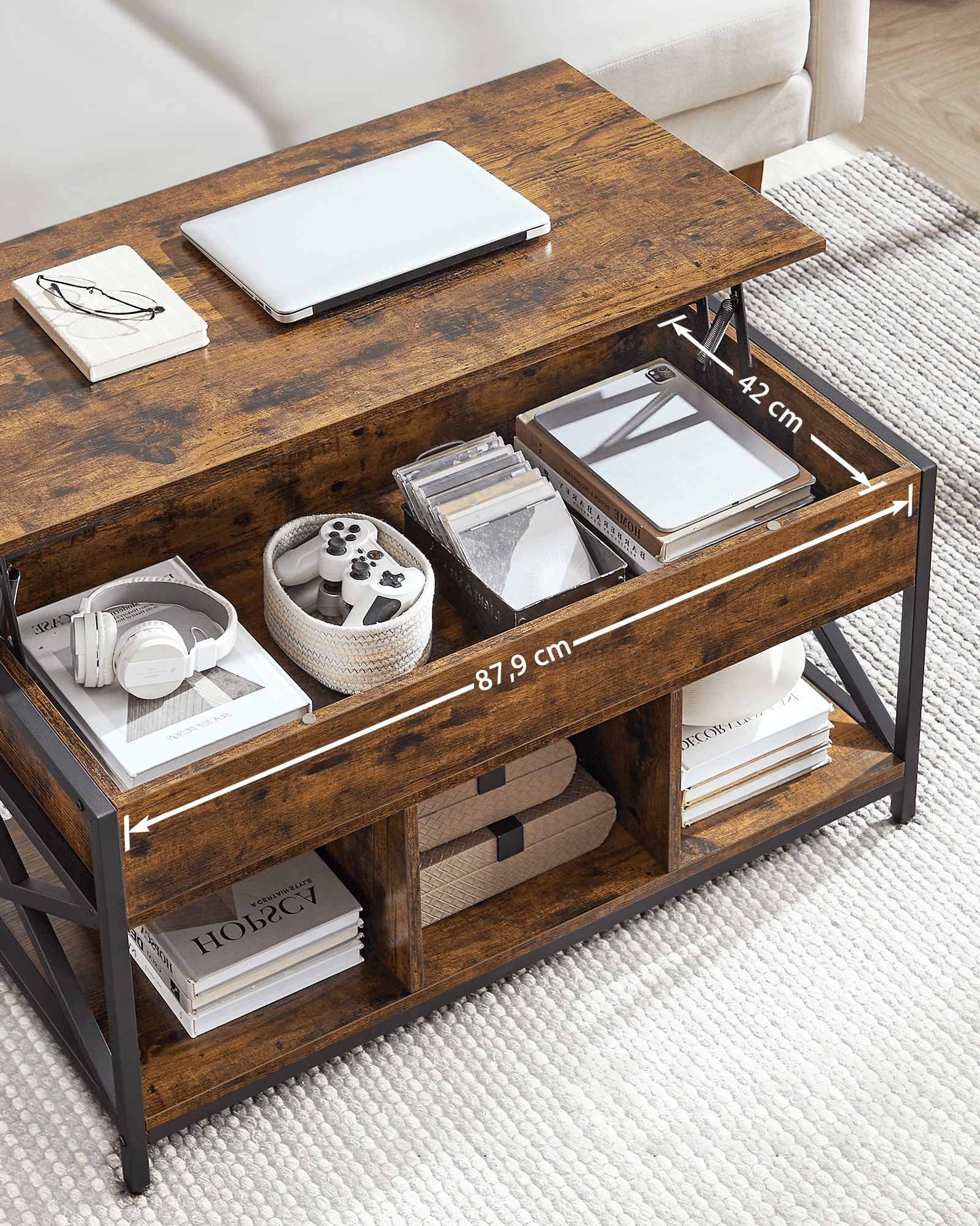 Tinkami matmenys suteikia pakankamai vietos kavos puodeliams, nešiojamam kompiuteriui, televizoriaus nuotolinio valdymo pultui ir padėklui su užkandžiais. Papildomas privalumas yra tas, kad stalviršį galima pakelti nuo 49 cm iki 62 cm aukščio, todėl atsiskleidžia erdvus daiktadėžės skyrius. Lofto stiliaus baldai yra naujausia mada. Stalas tikrai tiks prie daugelio kambarių dekoro. Metalinė konstrukcija užtikrina baldo stabilumą. Puikiai prigludę rėmo elementai ir rudos spalvos stalviršio išdėstymas suteiks jūsų interjerui žavesio.