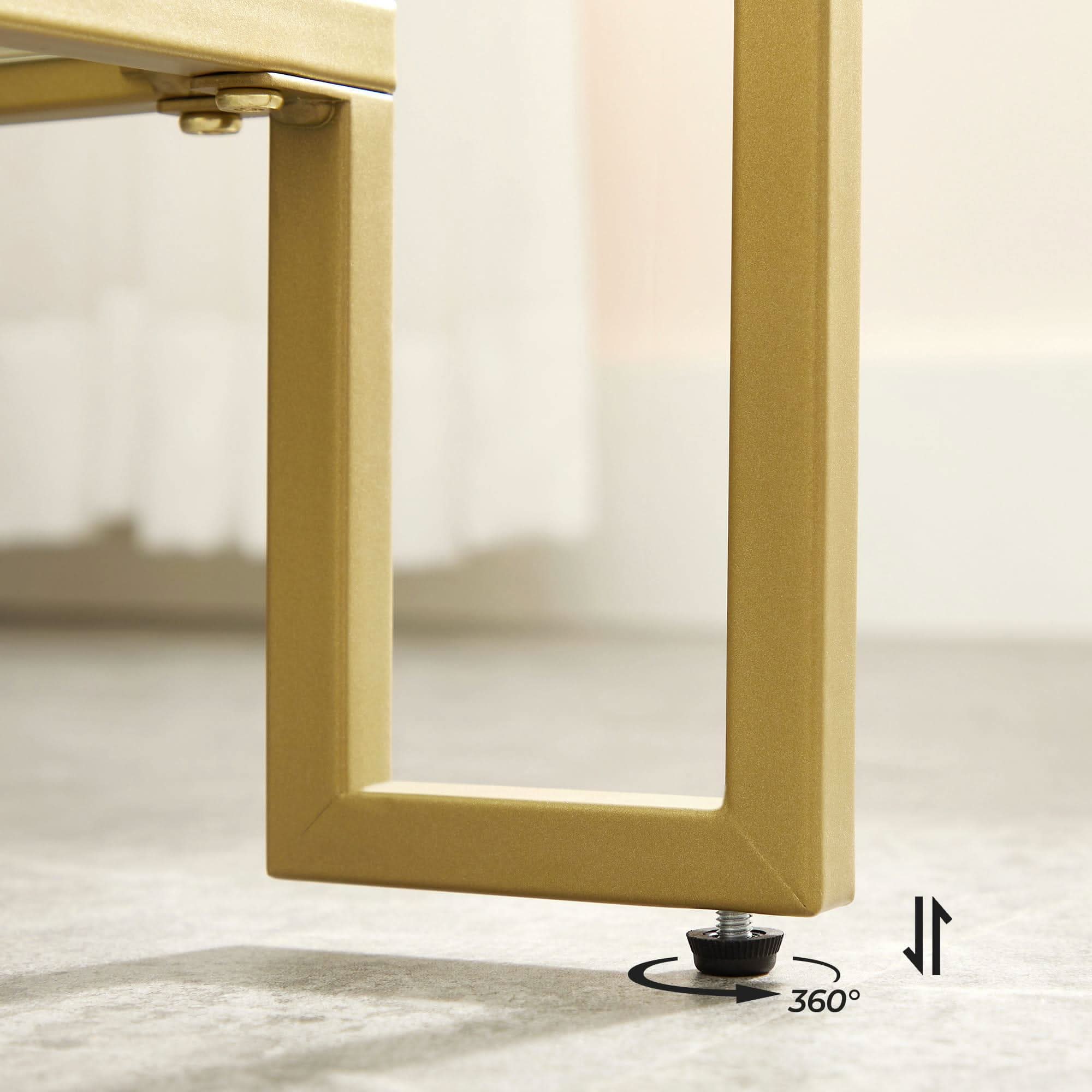 Staliukas pagamintas iš stiklo ir aukso milteliniu būdu dengto plieno. Produktas sukuria nuostabią jūsų svetainės puošmeną. Prabangi išvaizda tikrai tiks prie daugelio kambarių dekoro. Plieninė konstrukcija užtikrina baldo stabilumą. Puikiai prigludę rėmo elementai ir stiklinis viršus suteiks jūsų interjerui žavesio.