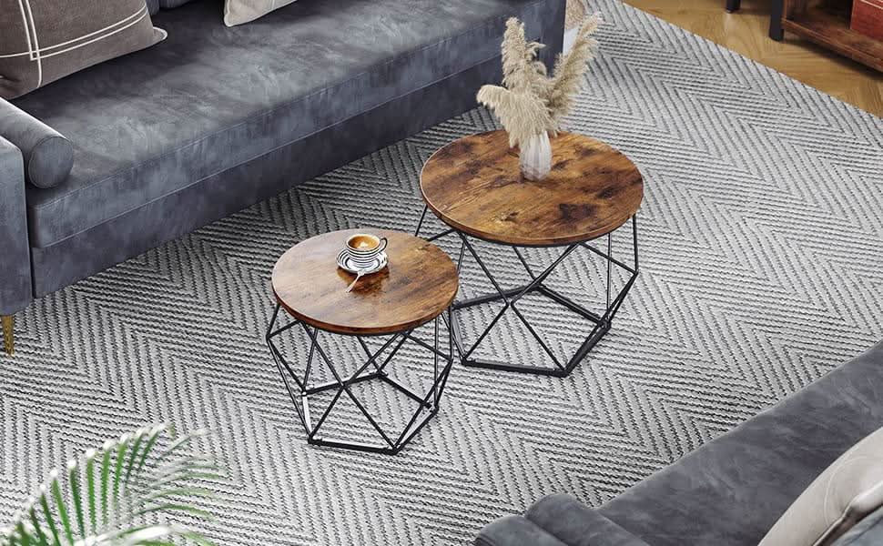 Kavos staliukai, kurie pradžiugins savo geometrine išvaizda ir pavers Jūsų svetainę erdvia patalpa. Lofto stiliaus baldai yra naujausia mada. Plieninė konstrukcija užtikrina baldų stabilumą. Puikiai suderinti pagrindo elementai ir rudo atspalvio stalviršių išdėstymas suteiks žavesio jūsų interjerui.