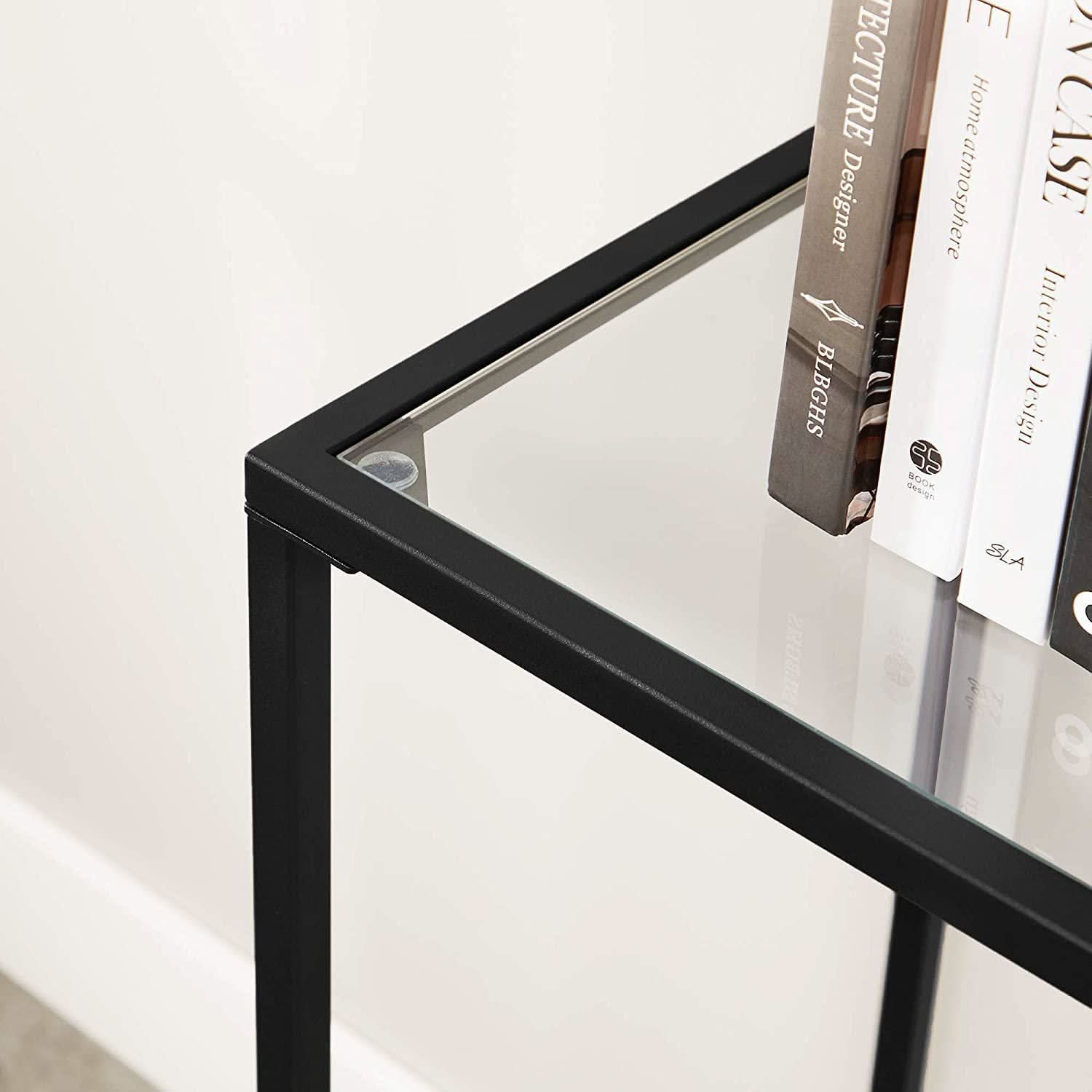 Konsolė pagaminta iš stiklo ir juodo milteliniu būdu padengto metalo. Produktas sukuria nuostabią jūsų kambario puošmeną. Konsolės lentyna yra stabili, todėl ant jos galime sudėti knygas, gėles į vazas, dekoratyvines figūrėles, vaikiškus žaislus, nuotraukų rėmelius. Tinkami konsolės matmenys suteikia pakankamai vietos mūsų daiktams.