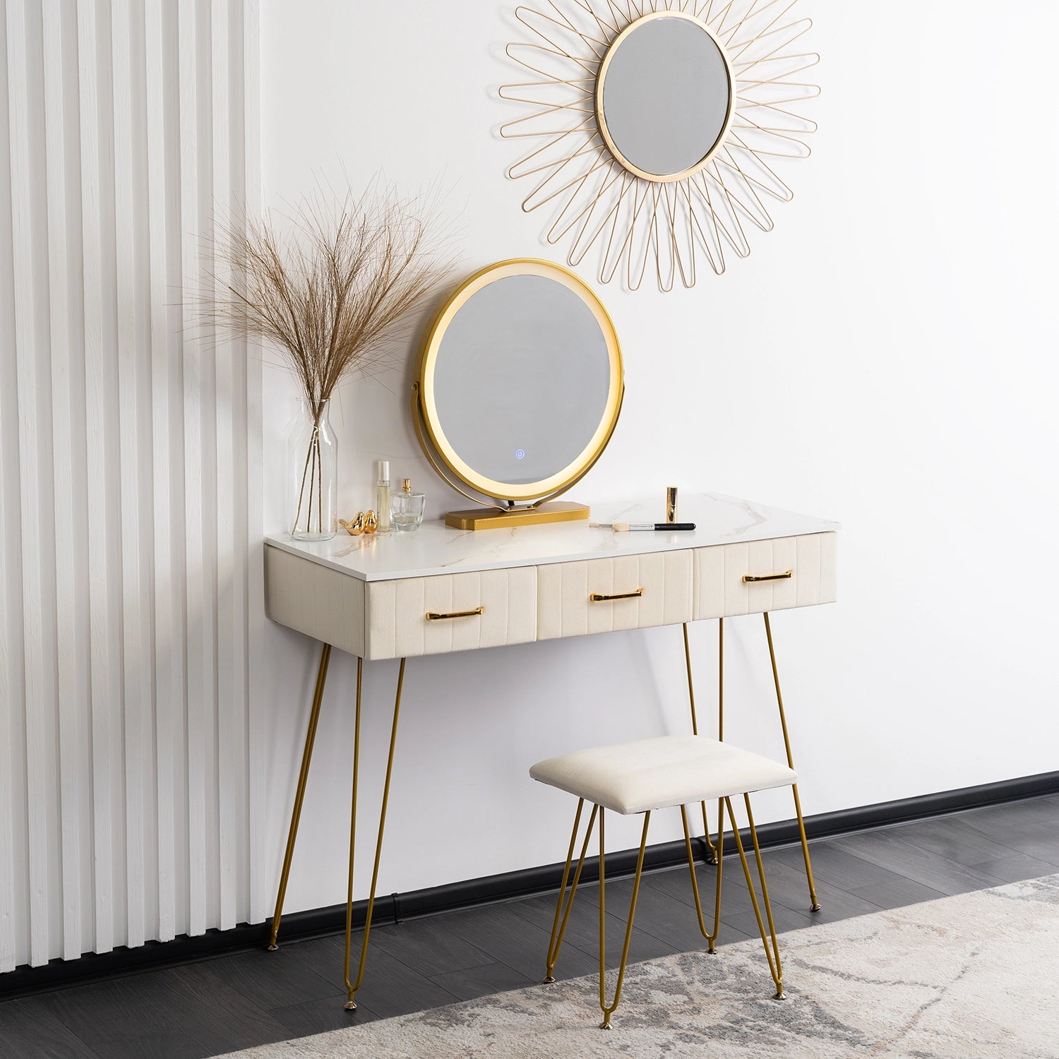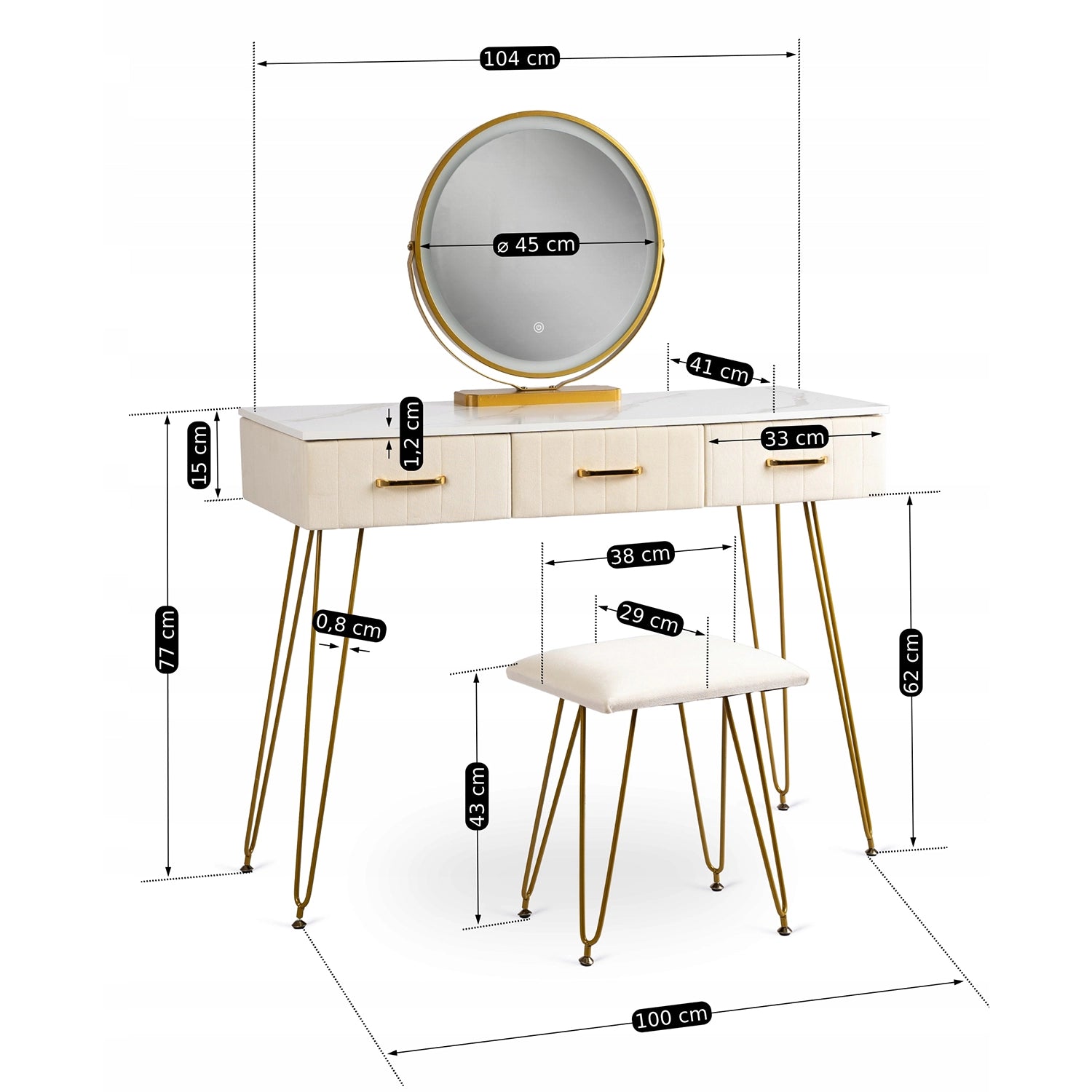 Kosmetinis staliukas SANDY su kėdute ir LED veidrodžiu, kreminis / auksinis