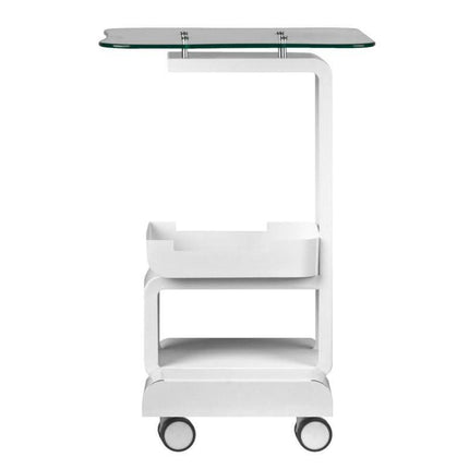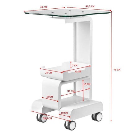 Funkcionalus, metalinis/stiklinis staliukas su guminiais ratukais ir su blokavimo funkcija. Puikiai tinka kaip staliukas kosmetologiniam prietaisui. Jame yra stabili lentynėlė įrenginiui ir kita lentynėlė priedams, o ratukų dėka stalas yra mobilus ir lengvai perkeliamas. Baldas suteikia patogumo ir komforto darbo metu.