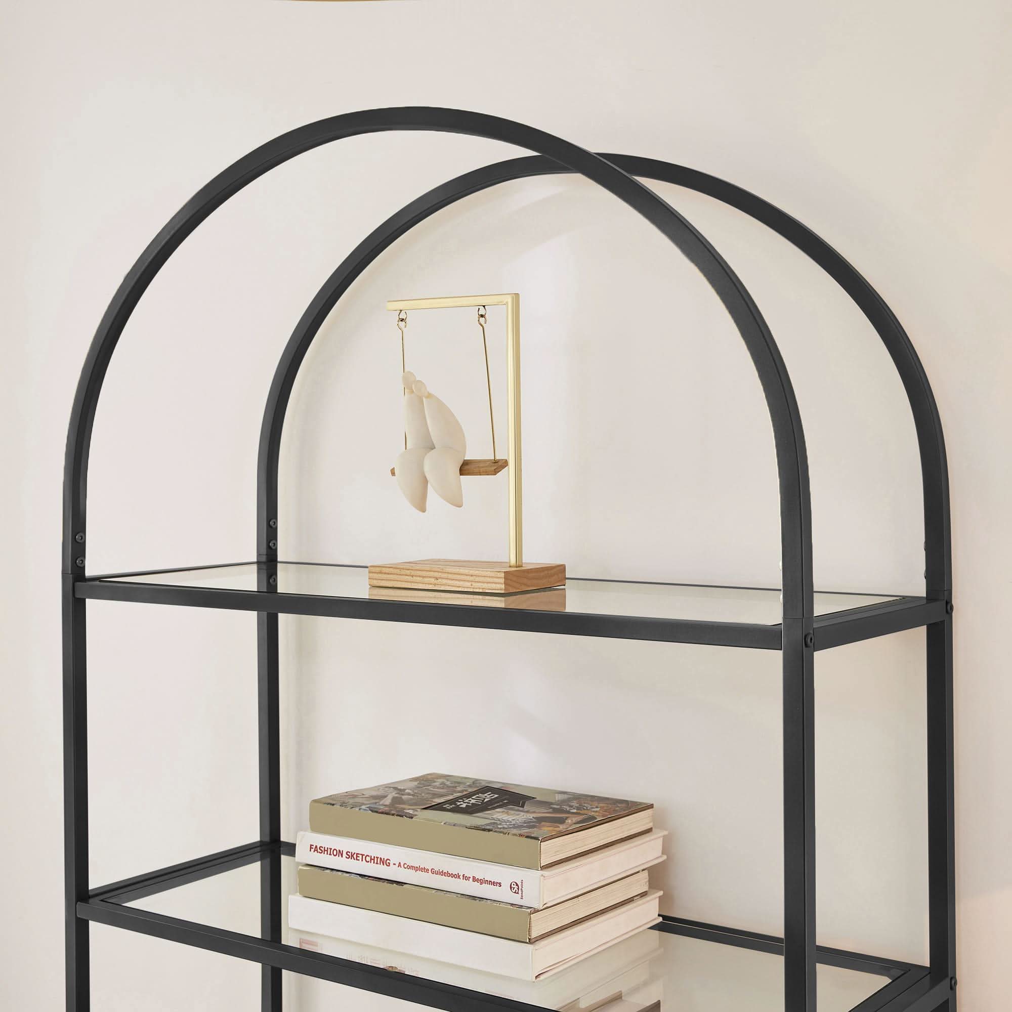 Lentyna pagaminta iš stiklo ir juodos spalvos milteliniu būdu dengto plieno. Dėl lenkto dizaino gaminys sukuria nuostabią jūsų kambario puošmeną. Lentynos yra stabilios, todėl ant jų galime statyti knygas, gėles vazose, dekoratyvines figūrėles, vaikų žaislus ir nuotraukų rėmelius. Modernus, prabangus ir kartu įdomus dizainas, šios savybės tikrai paskatins pasirinkti šį baldą. Pasižymi universalumu ir funkcionalumu, ji puikiai tiks svetainėje, miegamajame, vonios kambaryje, namų biure, virtuvėje, o jos 5 lentynos leis lengvai pasiekti mėgstamus daiktus. Plieninė konstrukcija užtikrina baldo stabilumą.