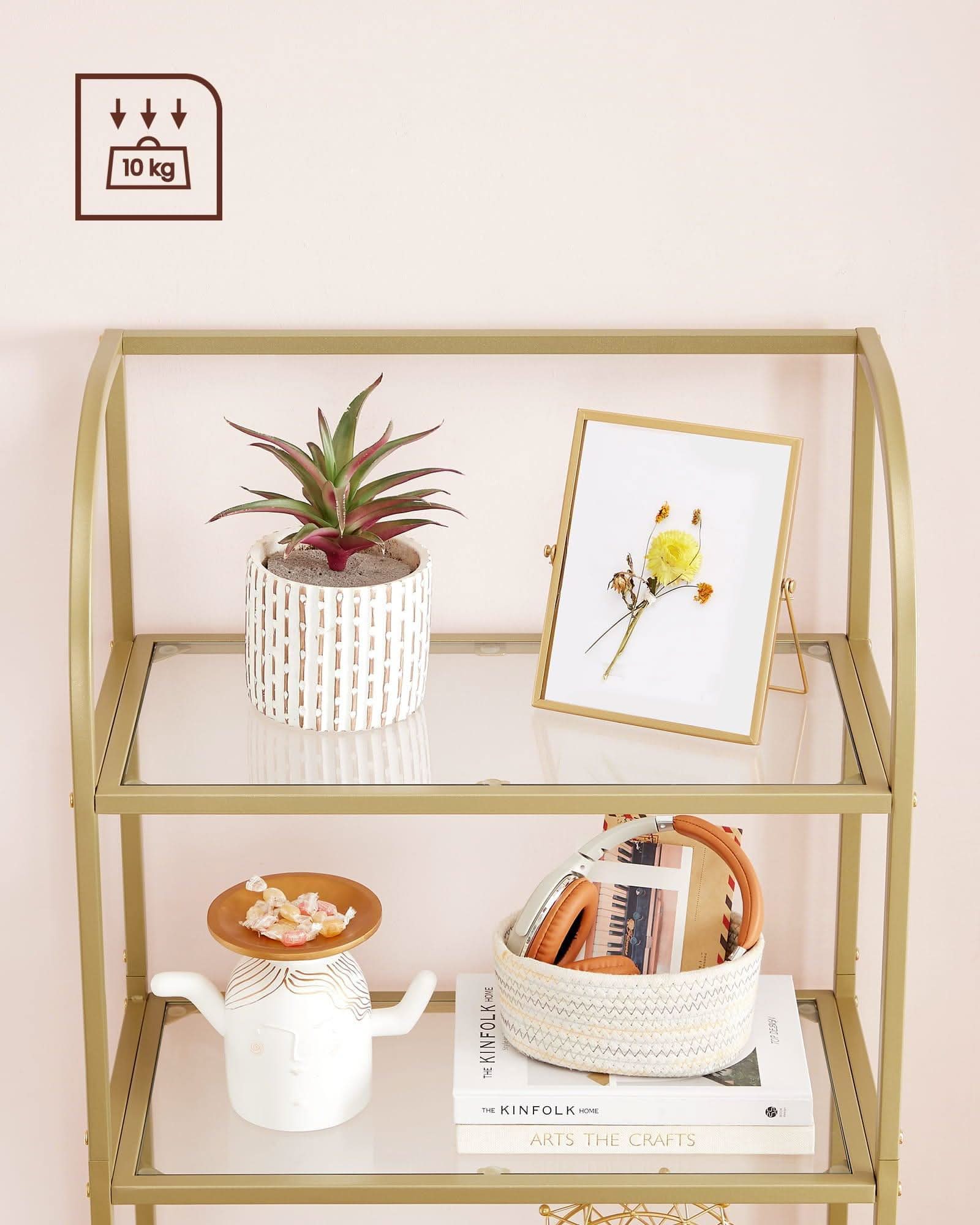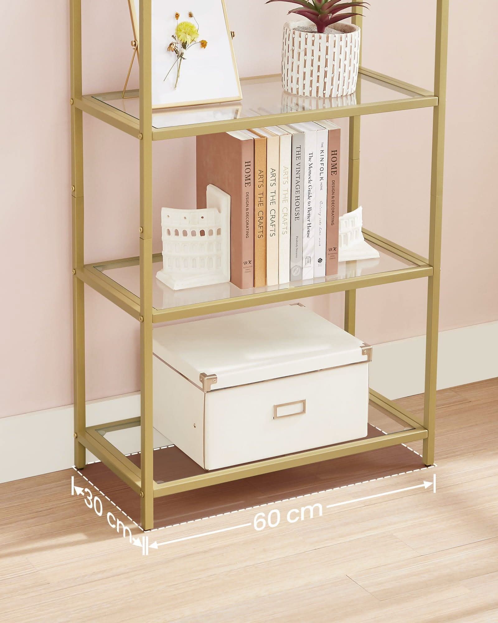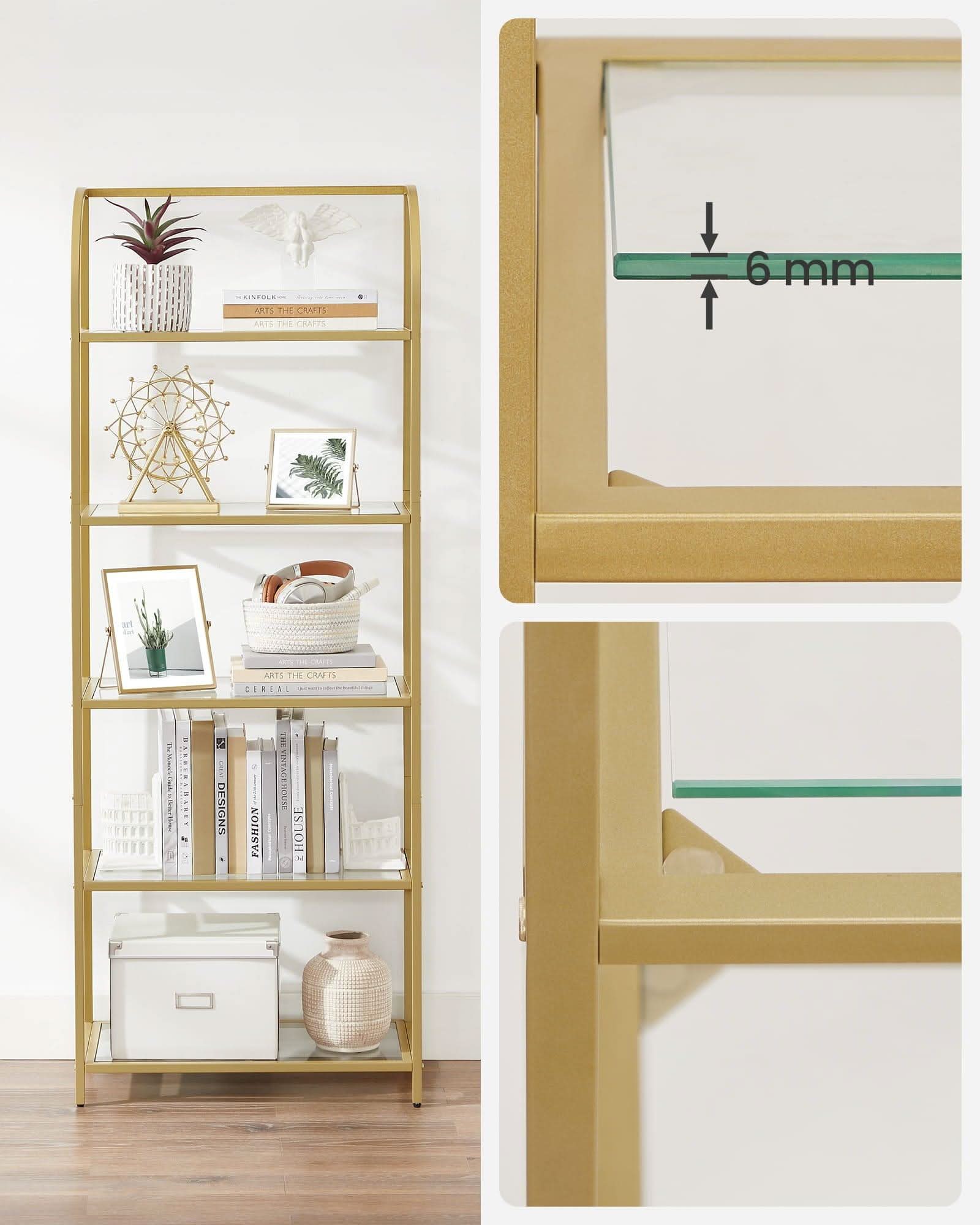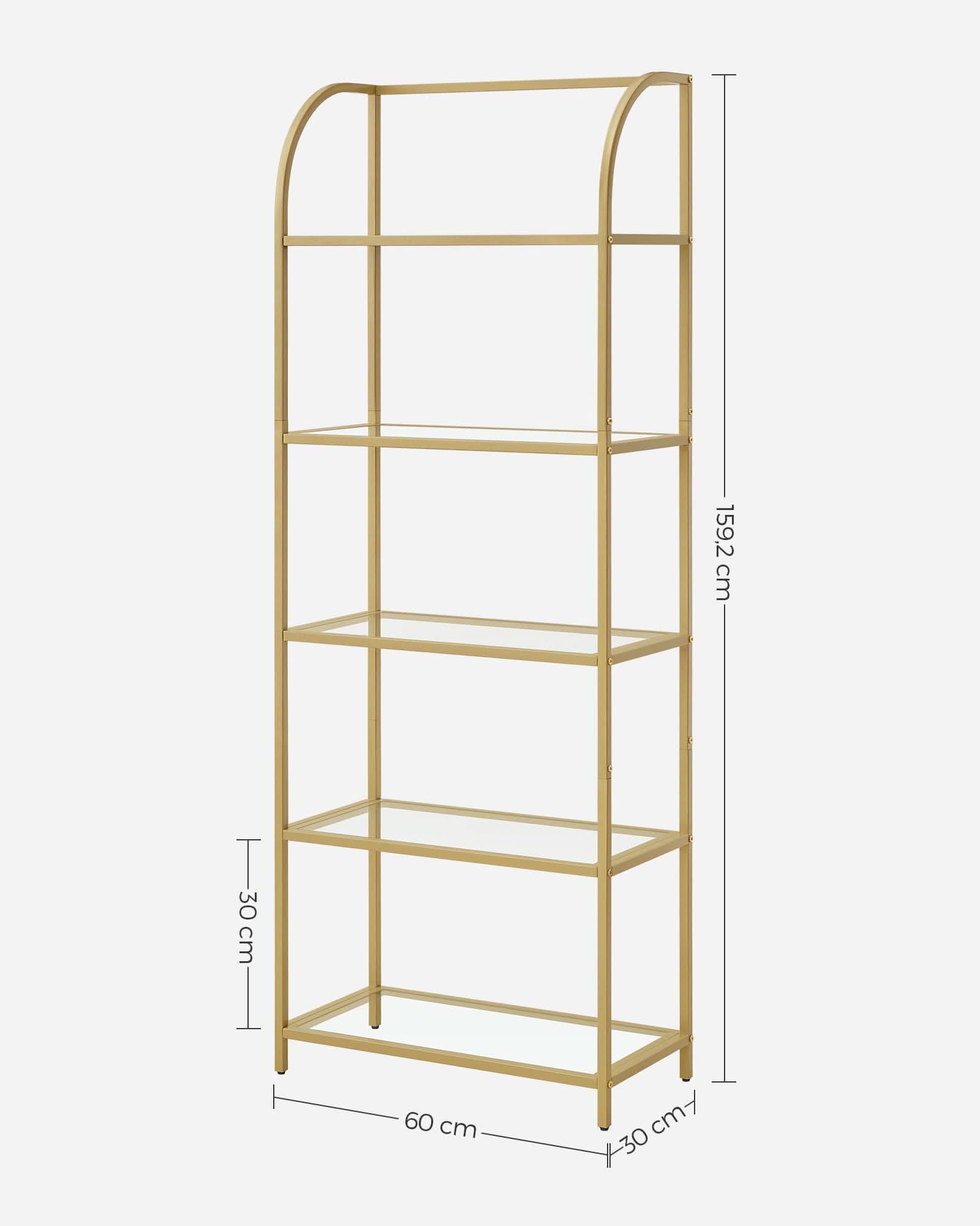 Lentyna pagaminta iš stiklo ir aukso milteliniu būdu dengto plieno. Dėl savo arkinio dizaino gaminys sukuria nuostabią jūsų kambario puošmeną. Lentynos yra stabilios, todėl ant jų galime sudėti knygas, gėles į vazas, dekoratyvines figūrėles, vaikiškus žaislus, nuotraukų rėmelius. Šiuolaikiška, prabangi ir tuo pačiu įdomi lentynos išvaizda – šios savybės tikrai paskatins rinktis šį baldą. Lentyna universali ir funkcionali, puikiai tiks svetainėje, miegamajame, vonios kambaryje, namų biure, virtuvėje, o 5 lentynos palengvins prieigą prie mėgstamų daiktų. Matinis rėmas su blizgančiomis dalelėmis suteikia nuostabų efektą. Plieninė konstrukcija užtikrina baldo stabilumą.