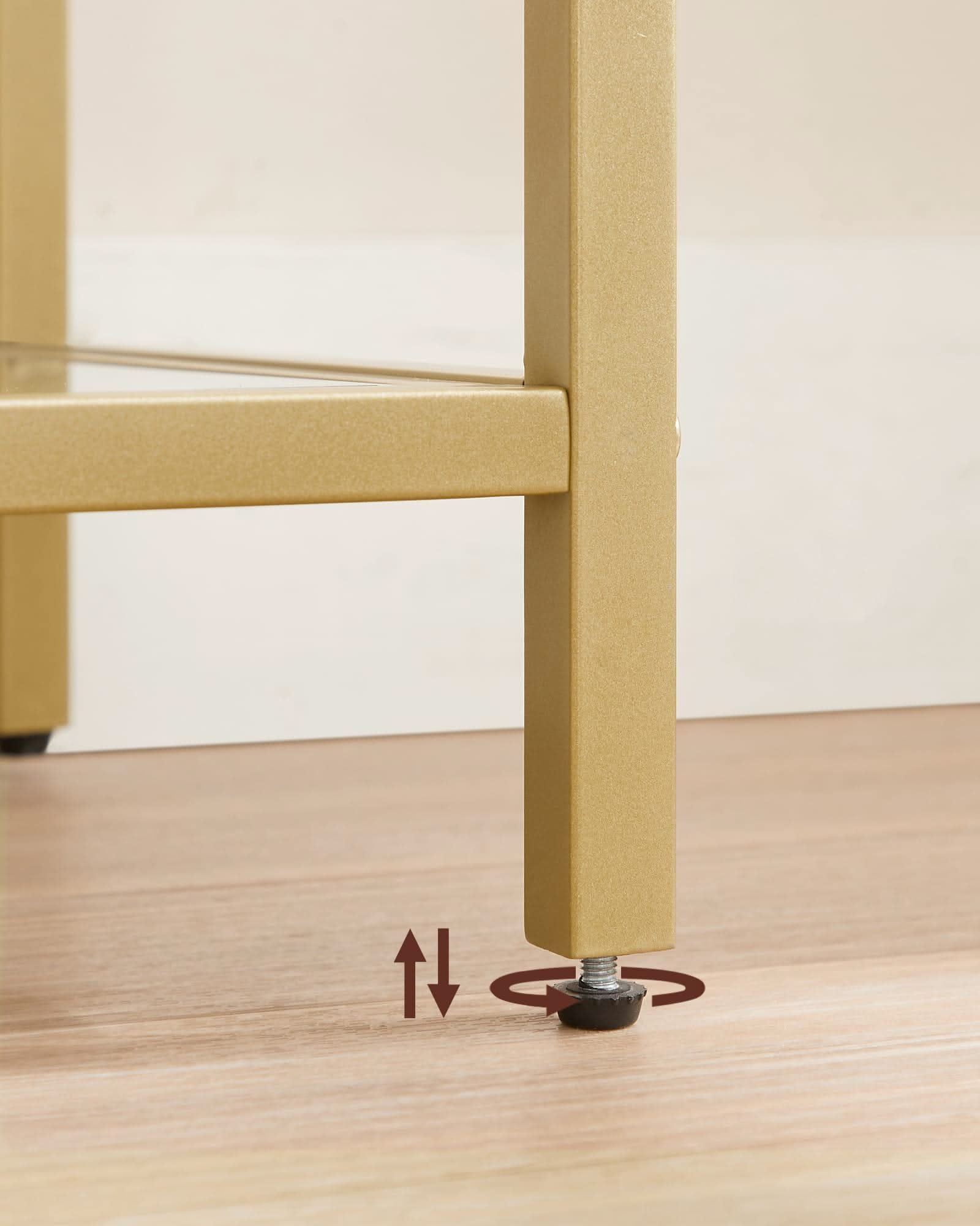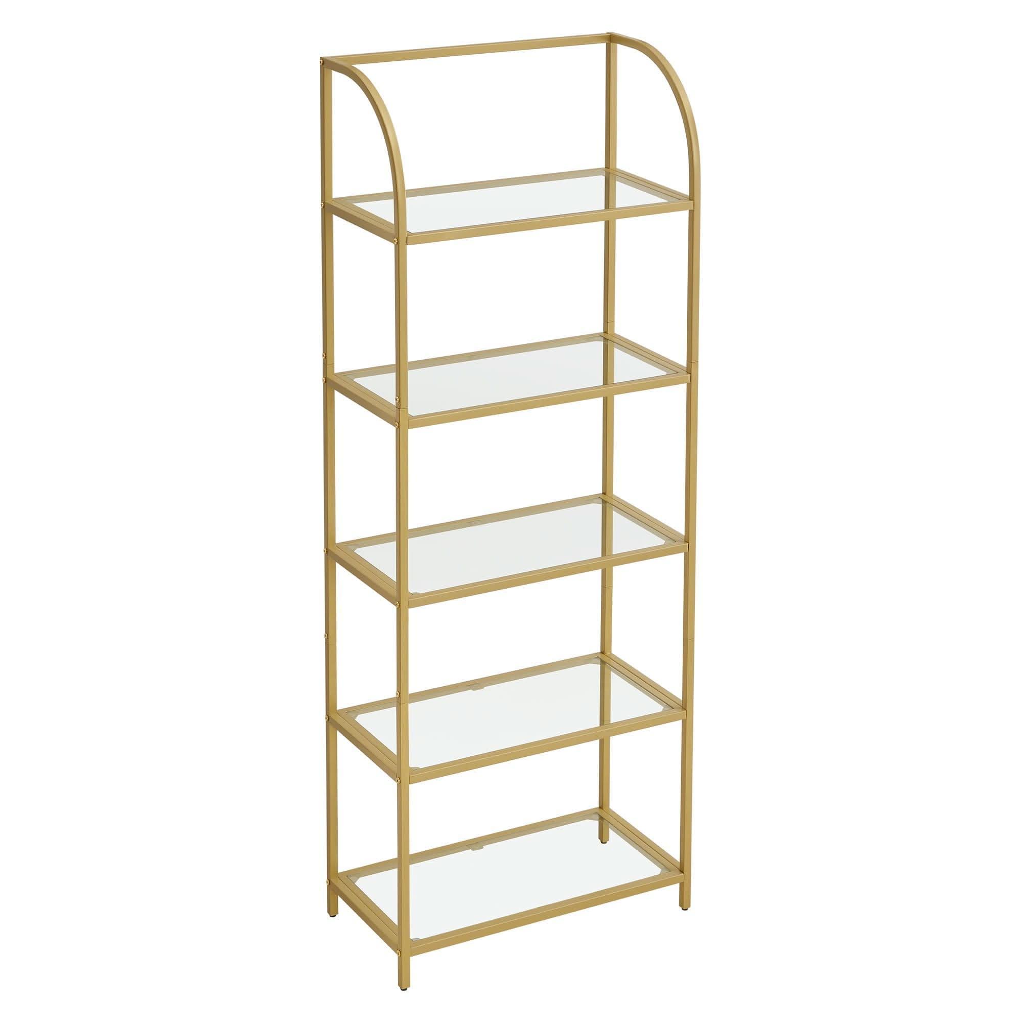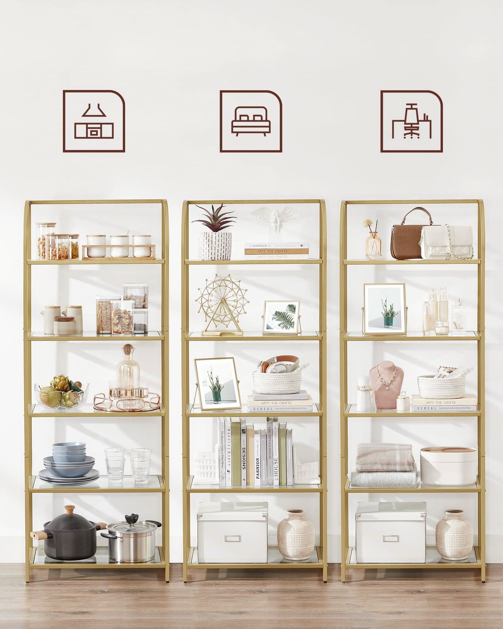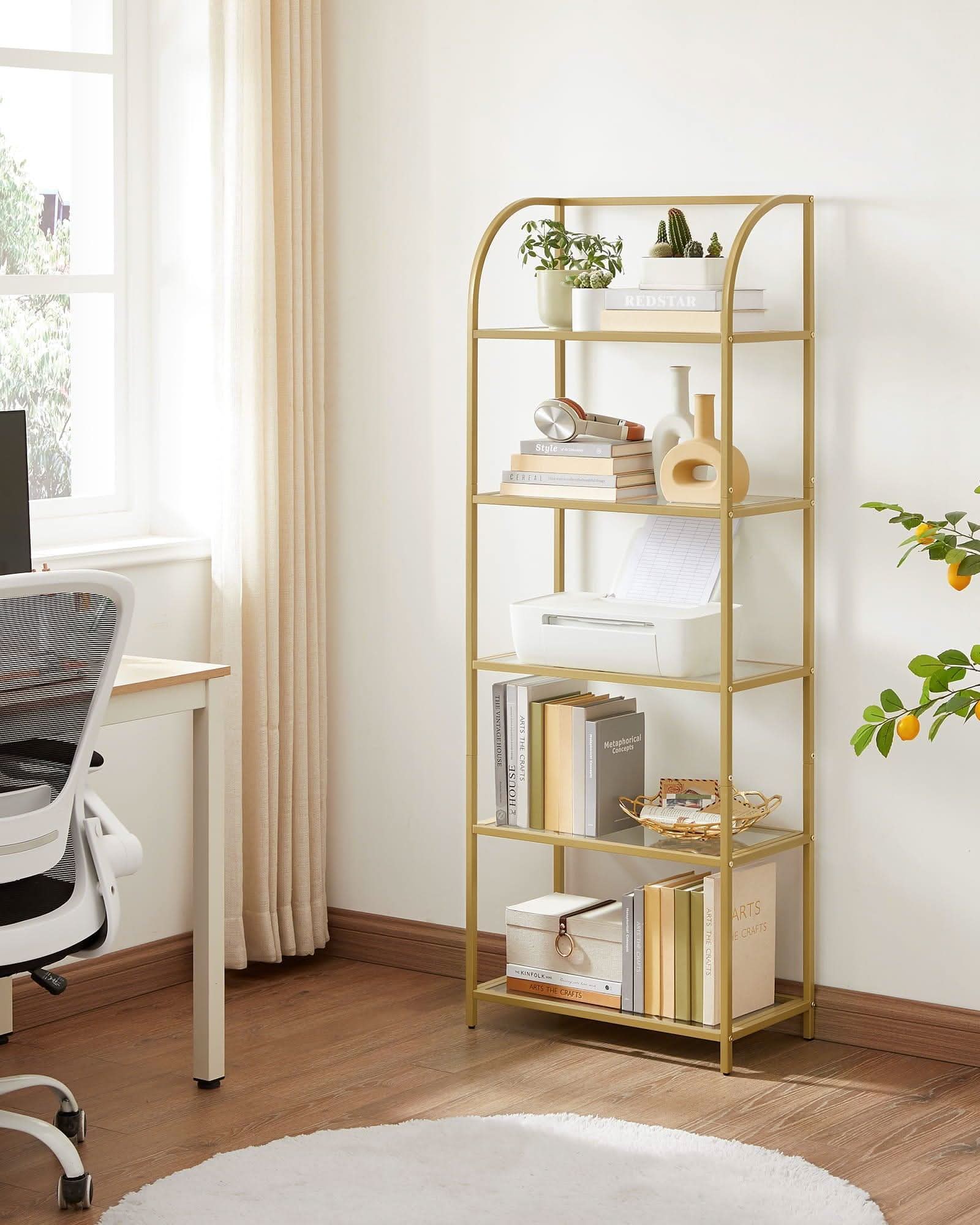 Lentyna pagaminta iš stiklo ir aukso milteliniu būdu dengto plieno. Dėl savo arkinio dizaino gaminys sukuria nuostabią jūsų kambario puošmeną. Lentynos yra stabilios, todėl ant jų galime sudėti knygas, gėles į vazas, dekoratyvines figūrėles, vaikiškus žaislus, nuotraukų rėmelius. Šiuolaikiška, prabangi ir tuo pačiu įdomi lentynos išvaizda – šios savybės tikrai paskatins rinktis šį baldą. Lentyna universali ir funkcionali, puikiai tiks svetainėje, miegamajame, vonios kambaryje, namų biure, virtuvėje, o 5 lentynos palengvins prieigą prie mėgstamų daiktų. Matinis rėmas su blizgančiomis dalelėmis suteikia nuostabų efektą. Plieninė konstrukcija užtikrina baldo stabilumą.