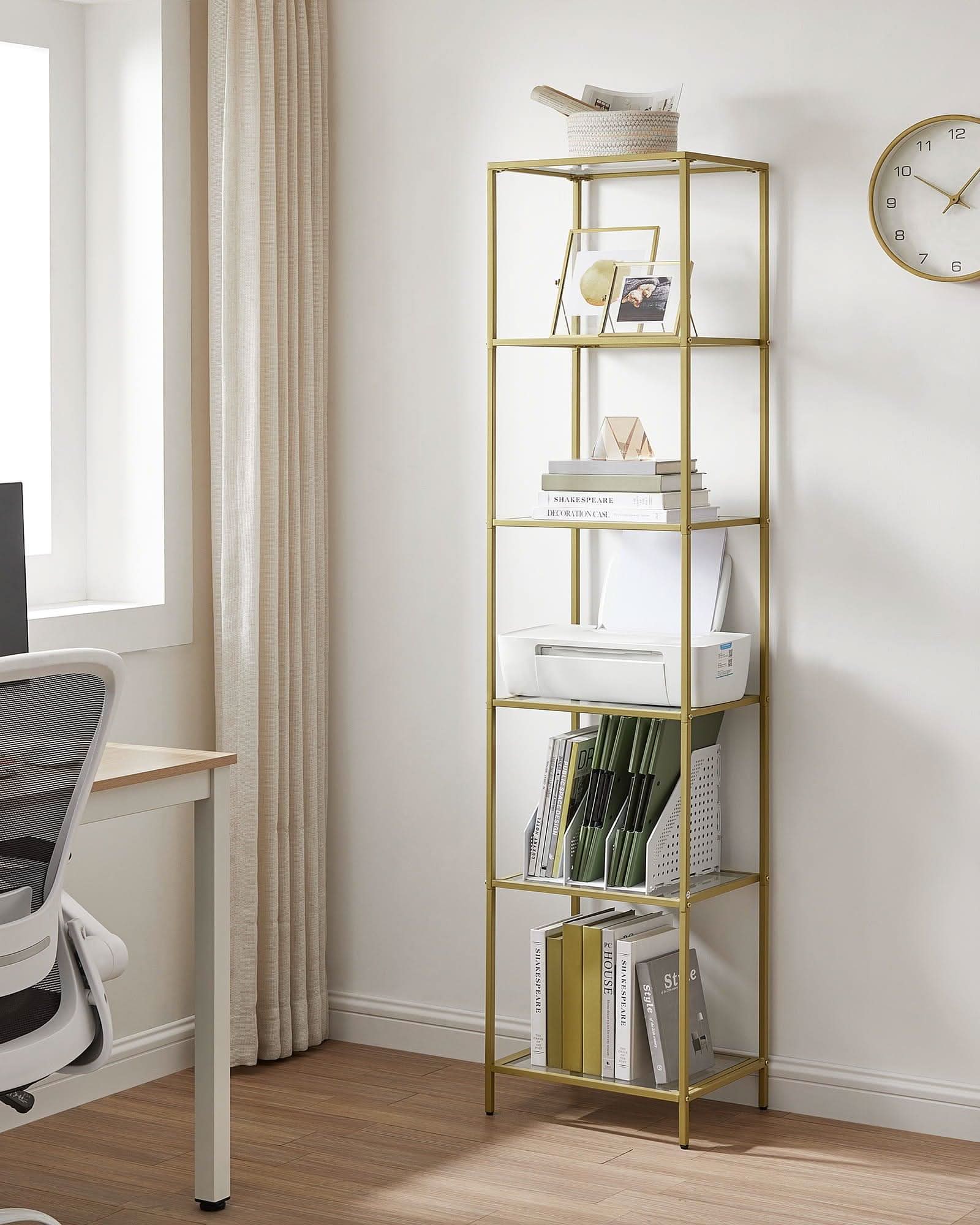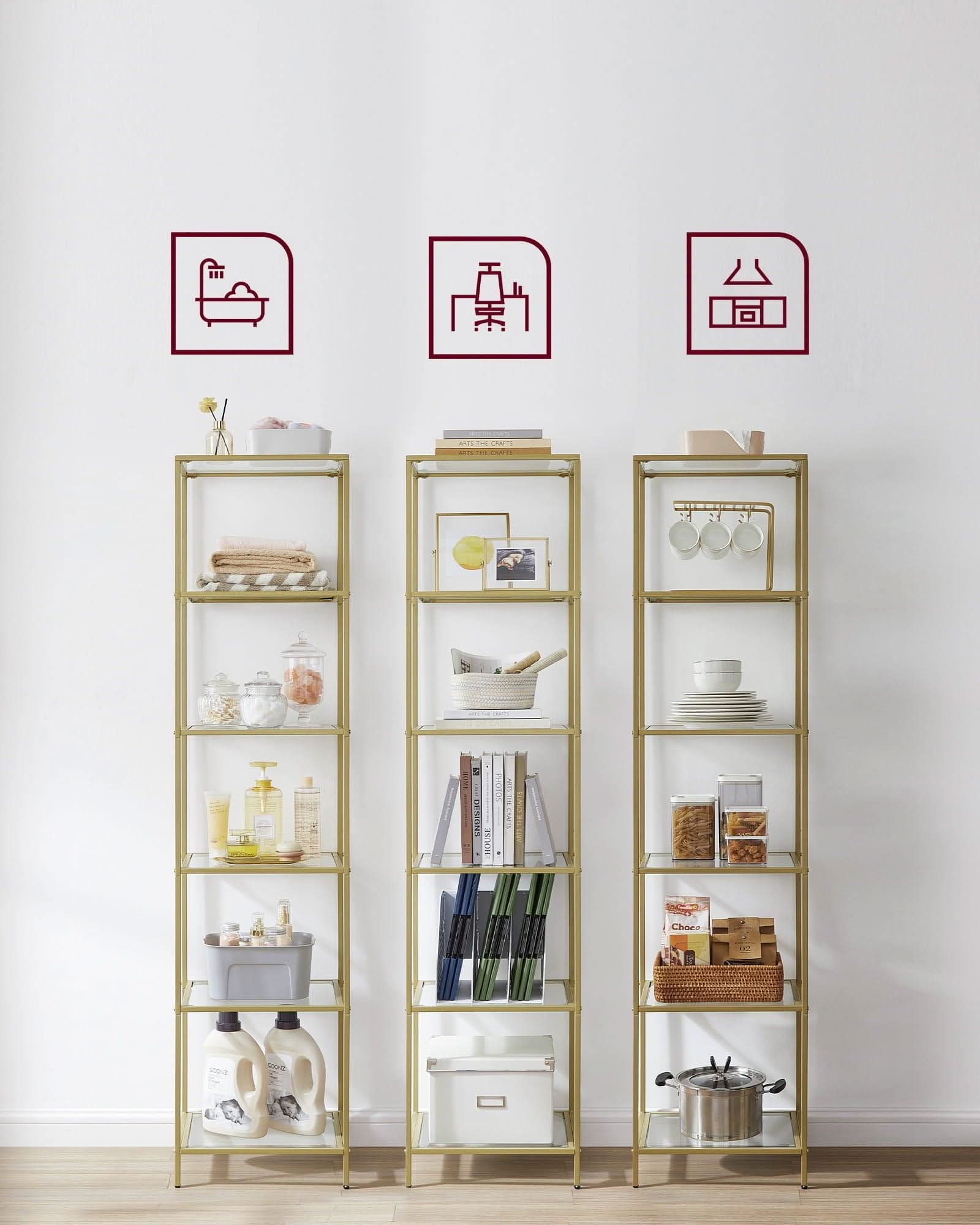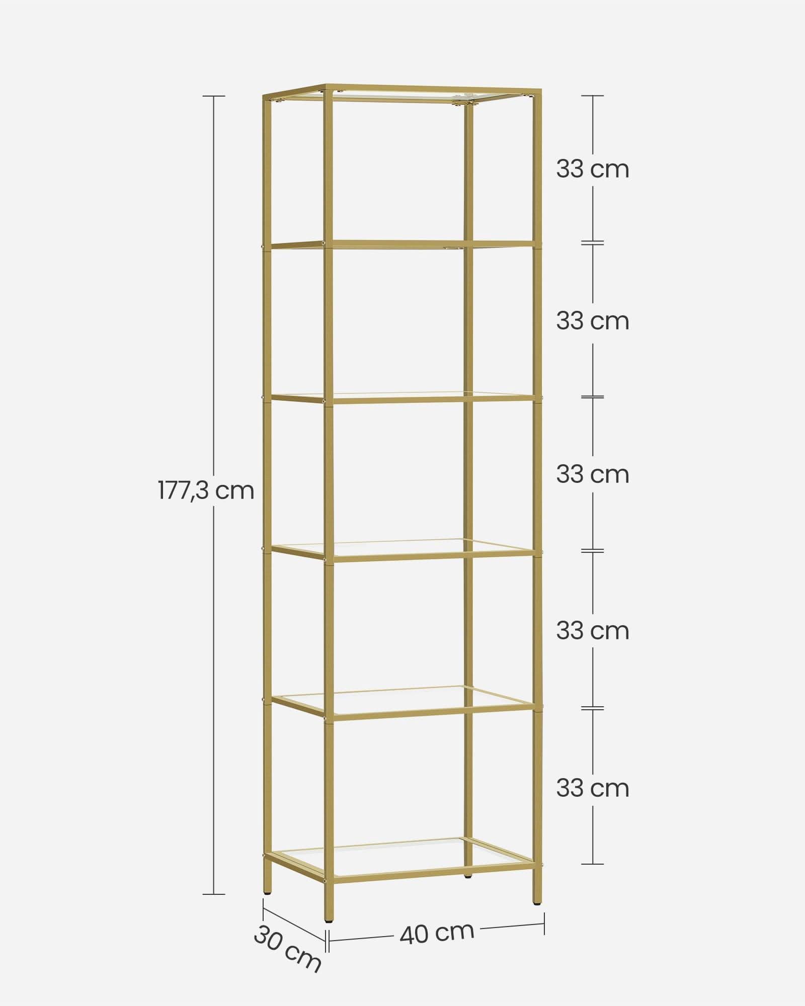 Šiuolaikiška, prabangi ir tuo pačiu paprasta lentynos išvaizda, šios savybės tikrai paskatins rinktis šį baldą. Lentyna universali ir funkcionali, puikiai tiks svetainėje, miegamajame, prieškambaryje, biure, virtuvėje, o 6 lentynos palengvins prieigą prie mėgstamų daiktų. Lentyna tikrai tiks prie daugelio kambarių dekoro. Matinis rėmas su blizgančiomis dalelėmis suteikia nuostabų efektą. Metalinė konstrukcija užtikrina baldo stabilumą. Puikiai sumontuotos rėmo ir stiklo elementų lentynos suteiks žavesio jūsų interjerui.