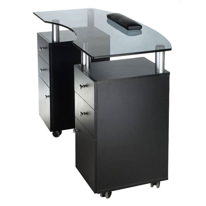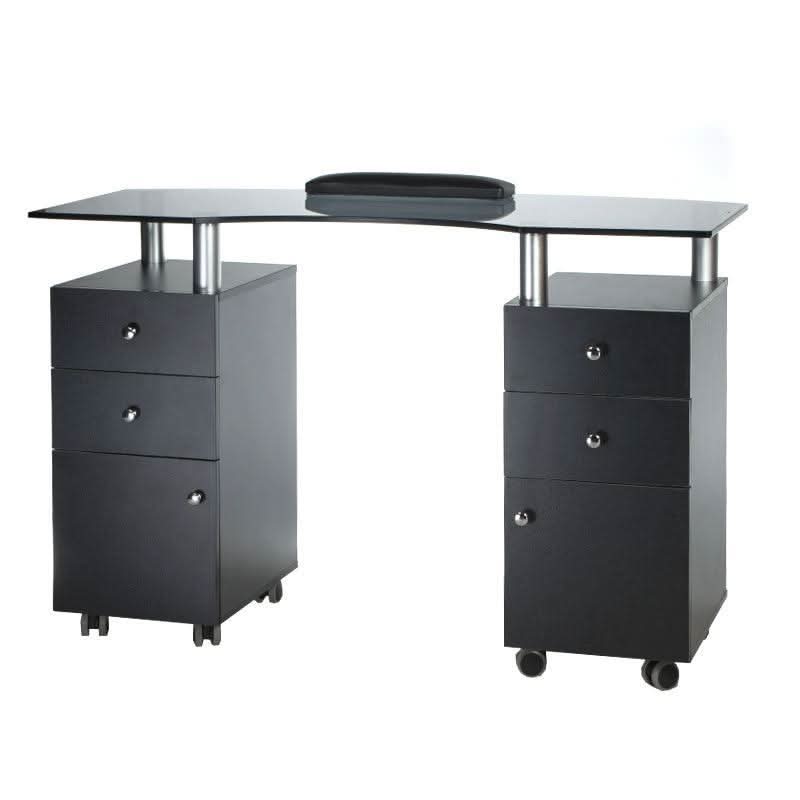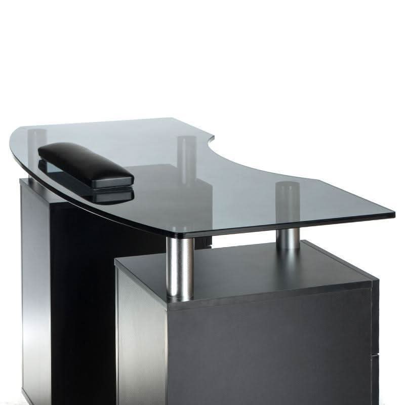 Siūlome labai elegantišką ir funkcionalų stalą su elegantišku juodo stiklo stalviršiu. BD-3453 manikiūro stalas yra mobilus, turi gilias spinteles ir praktiškus stalčius. Komplektą papildo patogi procedūrinė pagalvėlė.