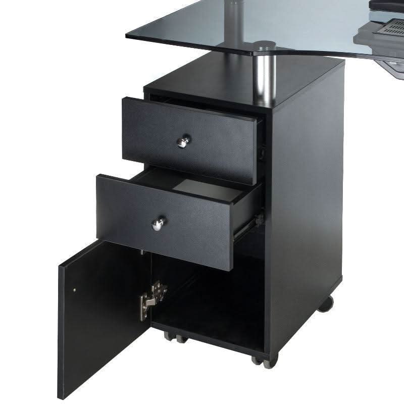 Siūlome labai elegantišką ir funkcionalų stalą su elegantišku juodo stiklo stalviršiu. BD-3453 manikiūro stalas yra mobilus, turi gilias spinteles ir praktiškus stalčius. Komplektą papildo patogi procedūrinė pagalvėlė.