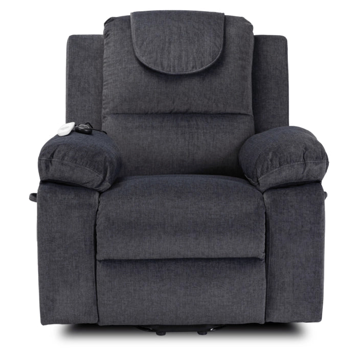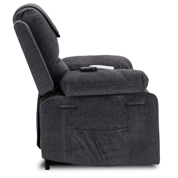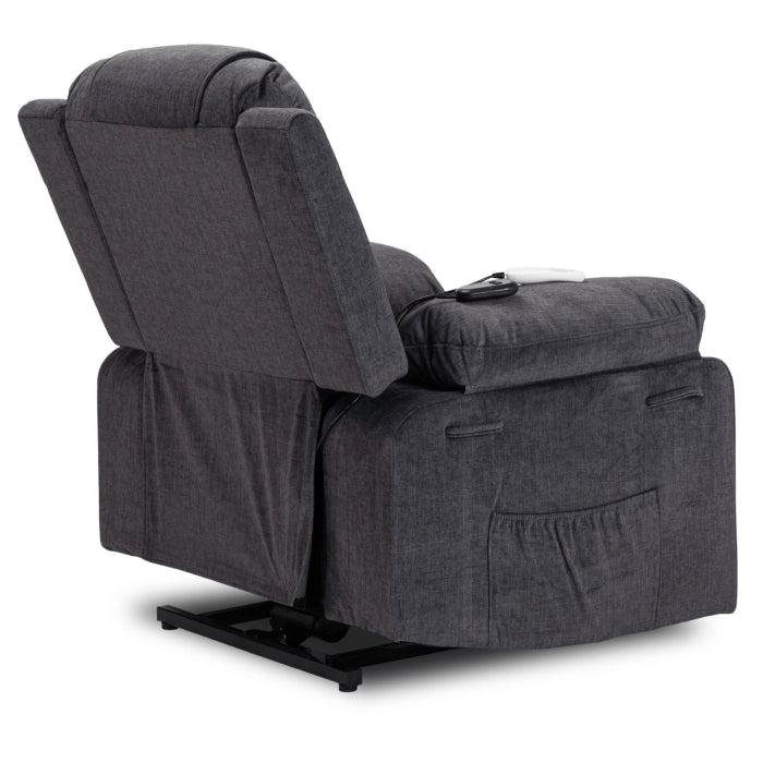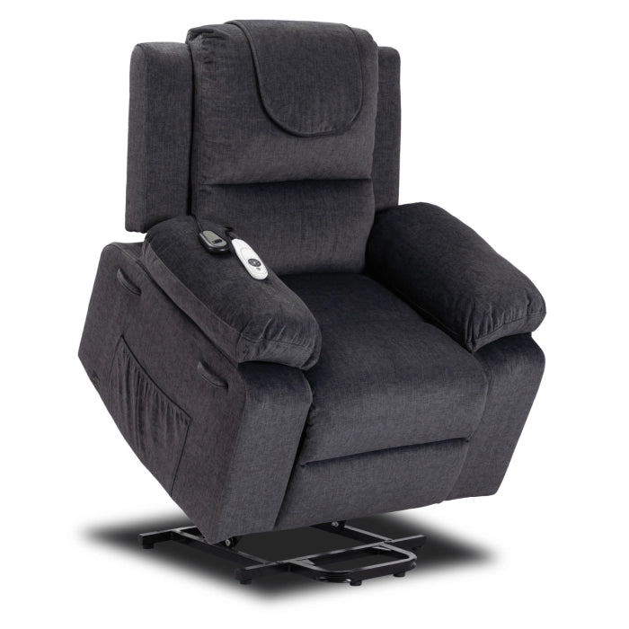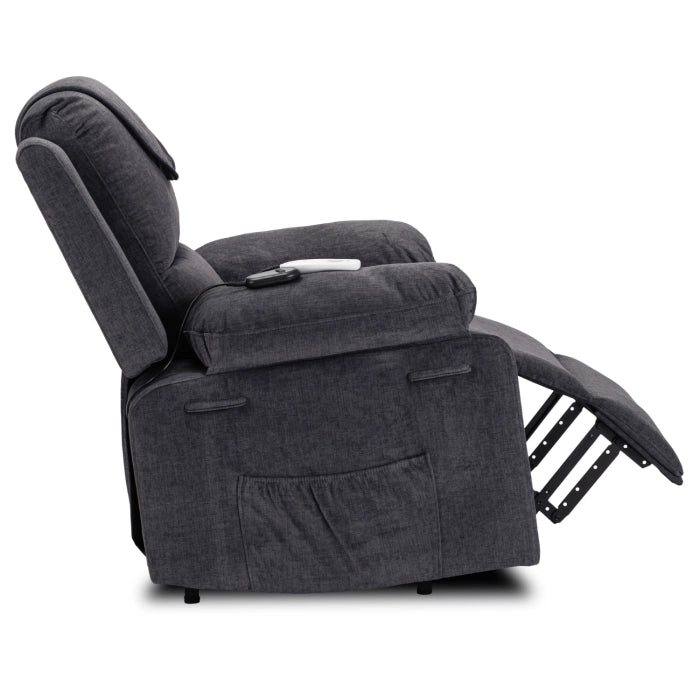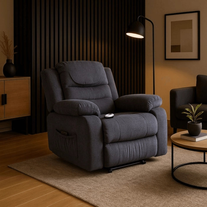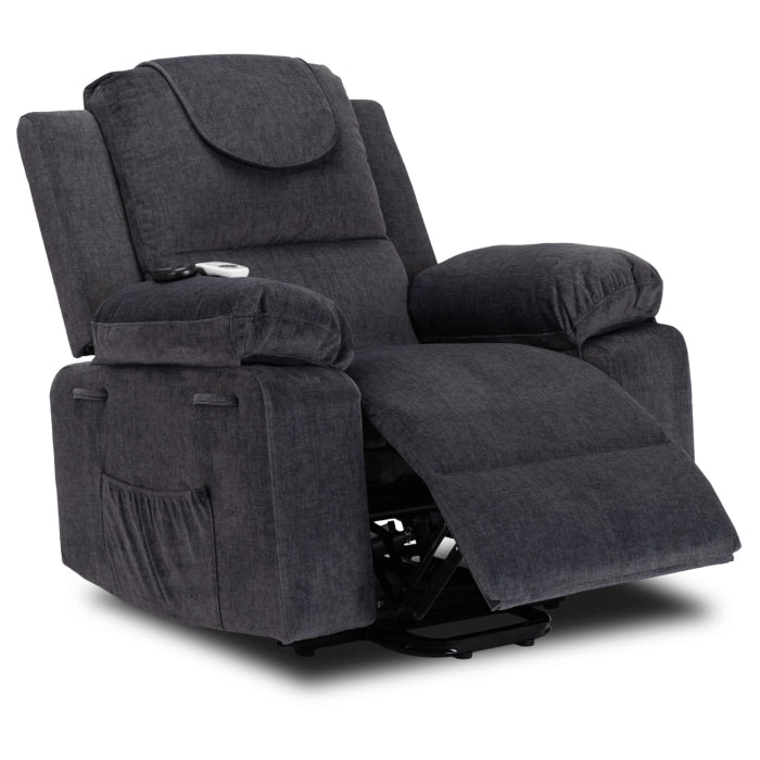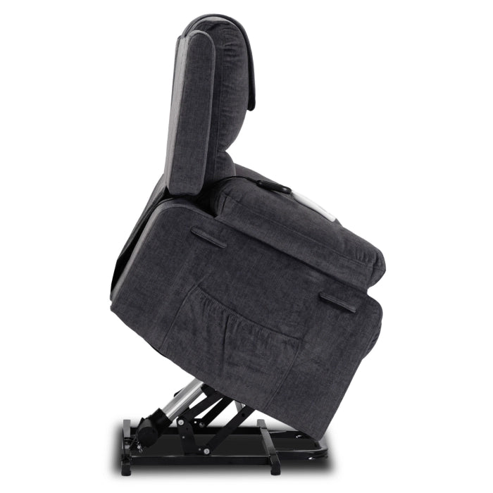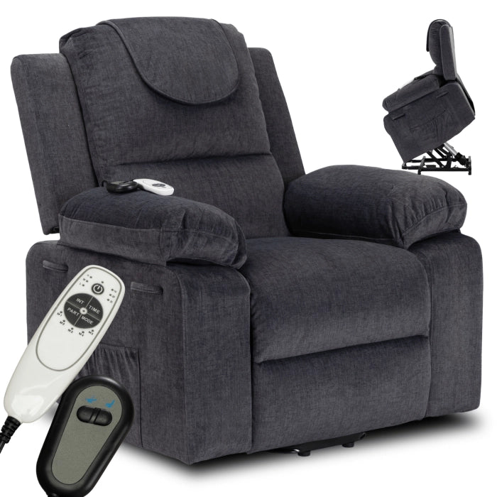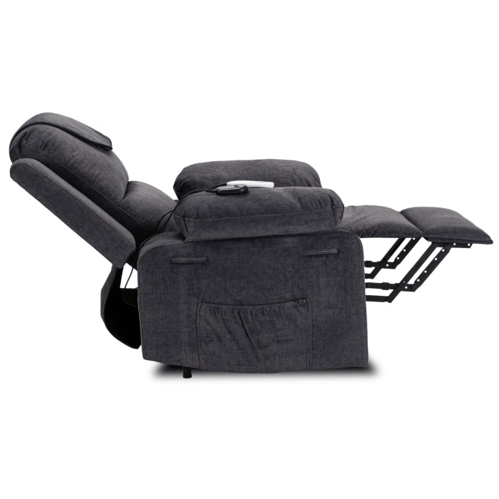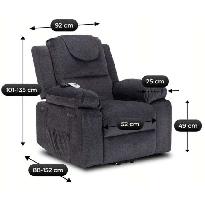 Masažinis fotelis FENIX su pakėlimo funkcija – elektrinis, išskleidžiamas, tamsiai pilkas