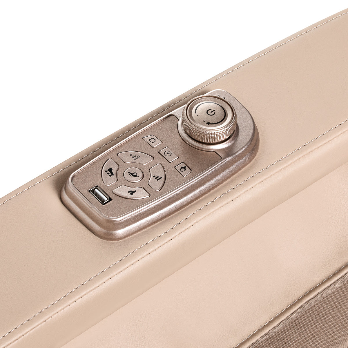 Dar didesniam patogumui, krėslas turi įmontuotus valdymo mygtukus kairiajame porankyje. Šis patogus valdymo pultas suteikia greitą prieigą prie svarbiausių funkcijų, nereikia ieškoti pagrindinio pulto. Juo galima lengvai pakeisti masažo režimą, įjungti pėdų masažą arba „Zero Gravity“ funkciją – viskas sukurta maksimaliam komfortui ir palaimingam atsipalaidavimui. Be to, krėslas turi USB jungtį, leidžiančią įkrauti telefoną masažo metu.