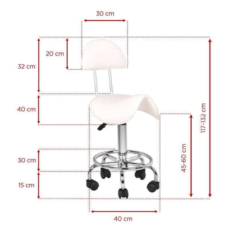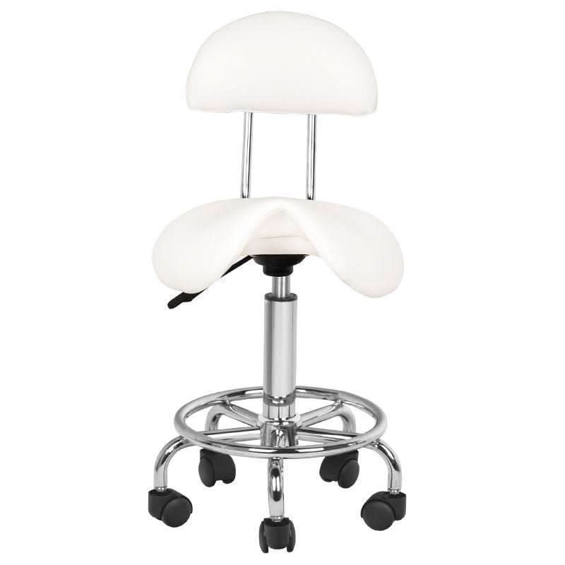 Patogi, stabili meistro kėdė su atlošu, su profiliuota sėdyne, ant penkiaašio pagrindo su plastikiniais ratukais. Baltos spalvos, būtinas baldas grožio salone.