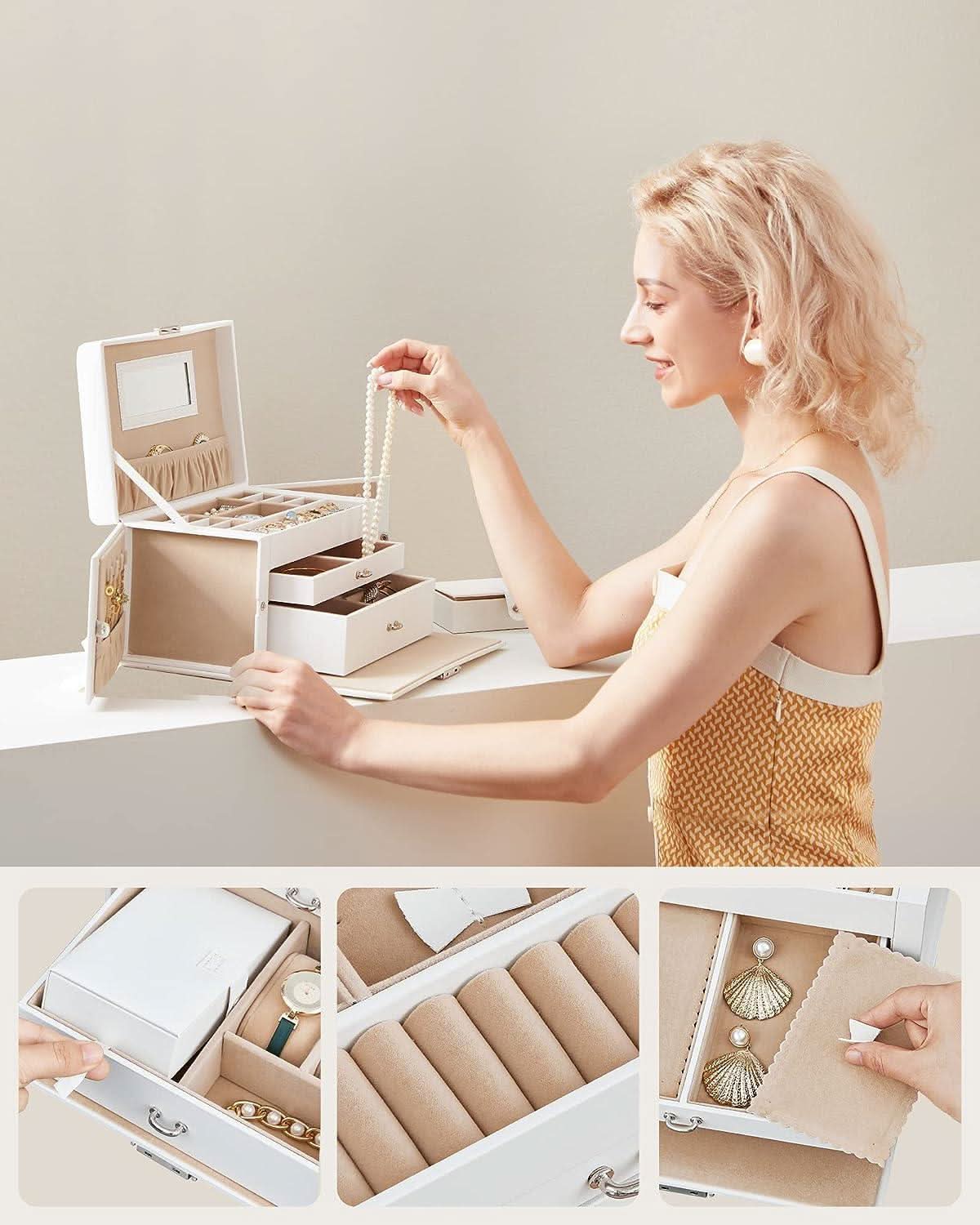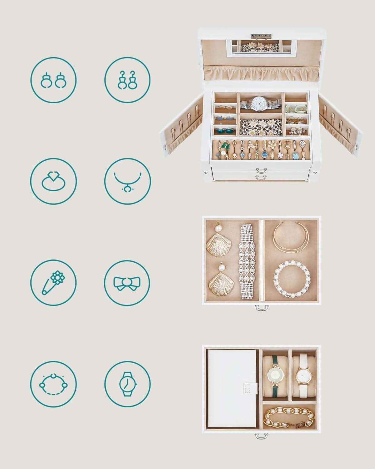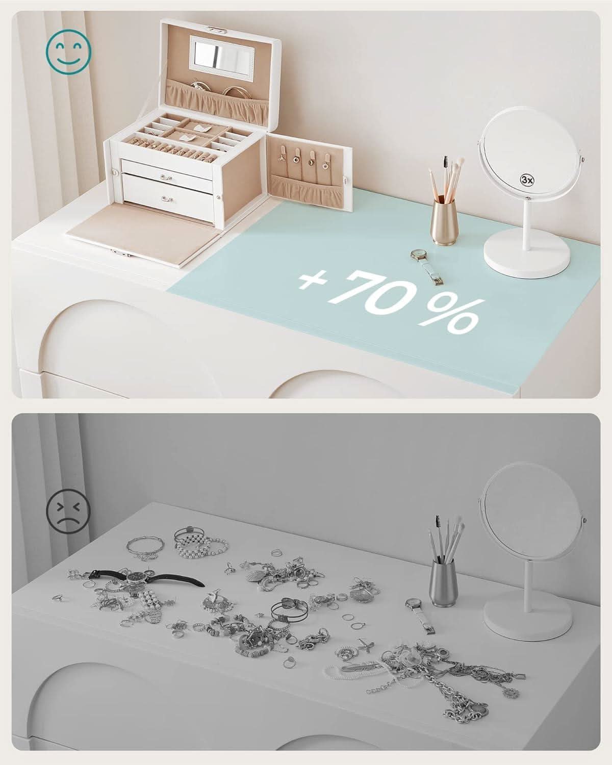 • 2 ištraukiami stalčiai, suskirstyti į skirtingo dydžio skyrius, į kuriuos galime dėti laikrodžius, apyrankes ir kitas vertybes.