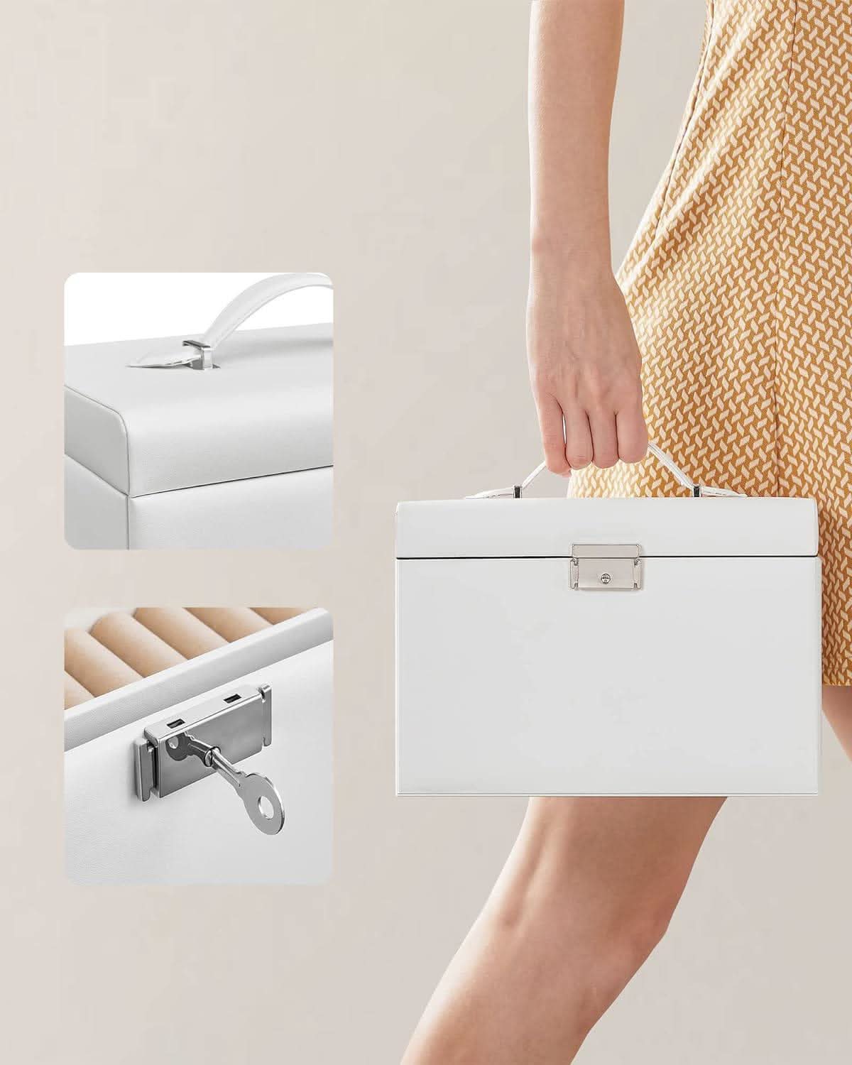 Papuošalų, laikrodžių, akinių ir kitų brangenybių dėžutė. Labai elegantiška ir praktiška, sidabro spalvos elementais dekoruota dėžutė derės prie bet kokio interjero, be to, bus puiki ir tinkama dovana bet kuriai moteriai. Dėžutės vidus užpildytas švelnia aksomo medžiaga.