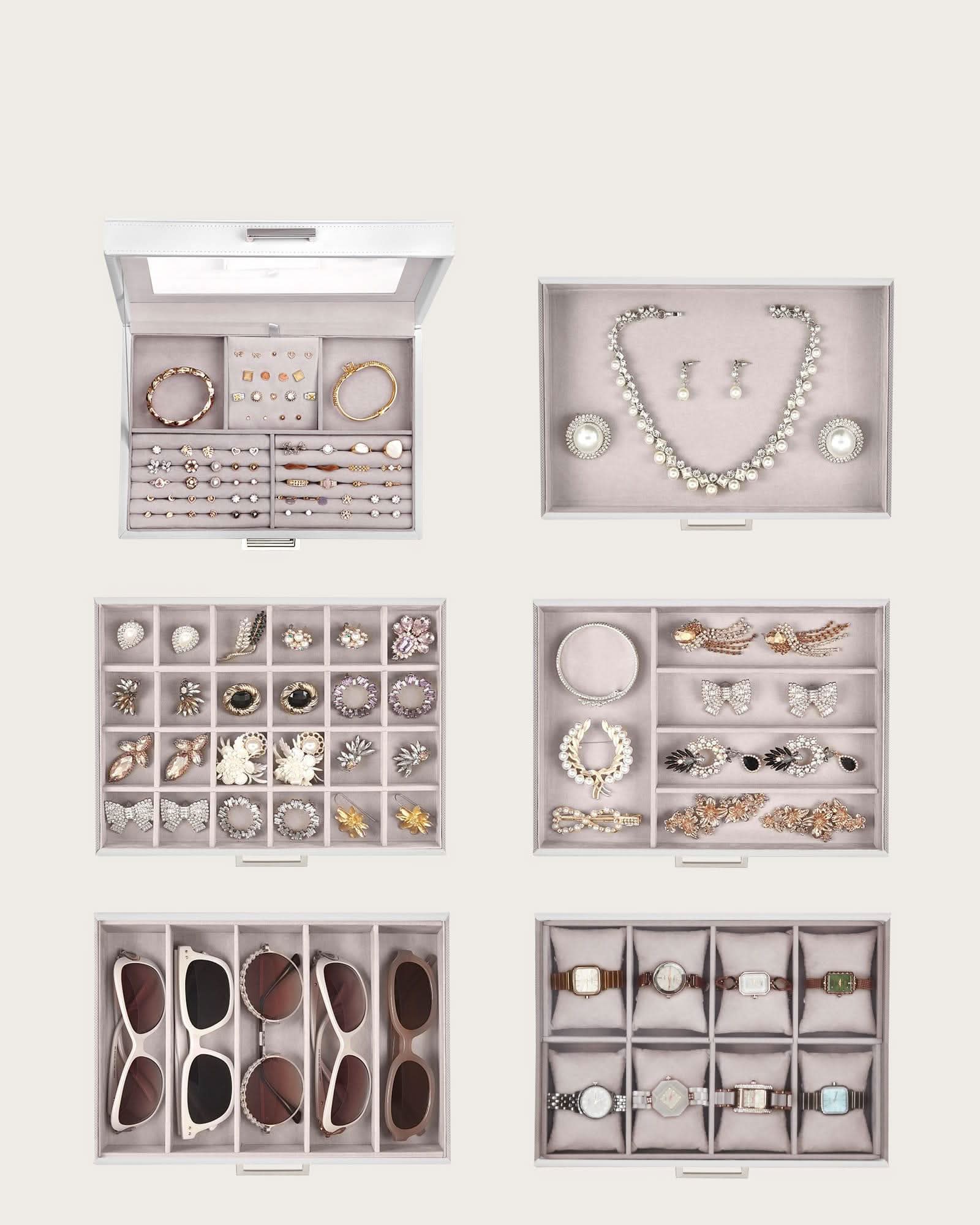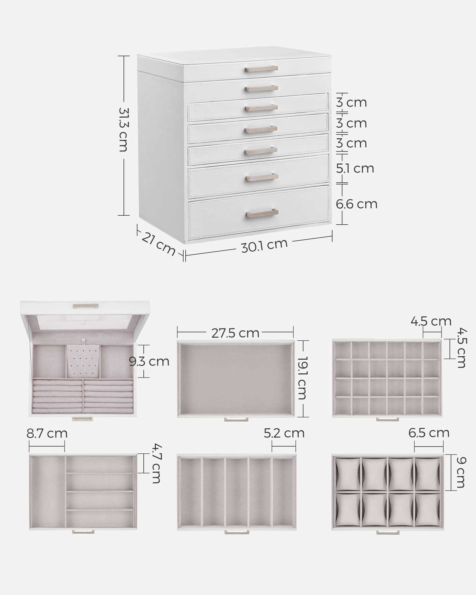 Papuošalų, laikrodžių, akinių ir kitų brangenybių dėžutė. Labai elegantiška ir praktiška, sidabro spalvos elementais dekoruota dėžutė derės prie bet kokio interjero, be to, bus puiki ir tinkama dovana bet kuriai moteriai. Dėžutės vidus užpildytas švelnia aksomine medžiaga.