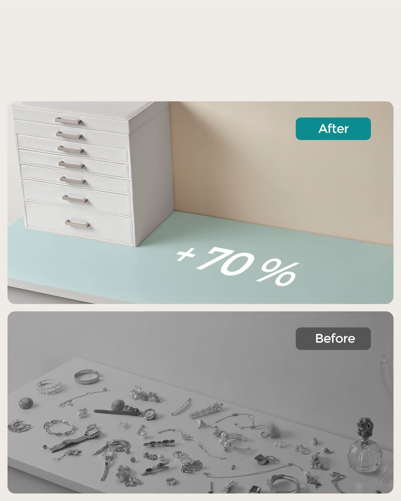 • 5 ištraukiamų stalčių, kurie suskirstyti į įvairaus dydžio skyrius, į kuriuos galime