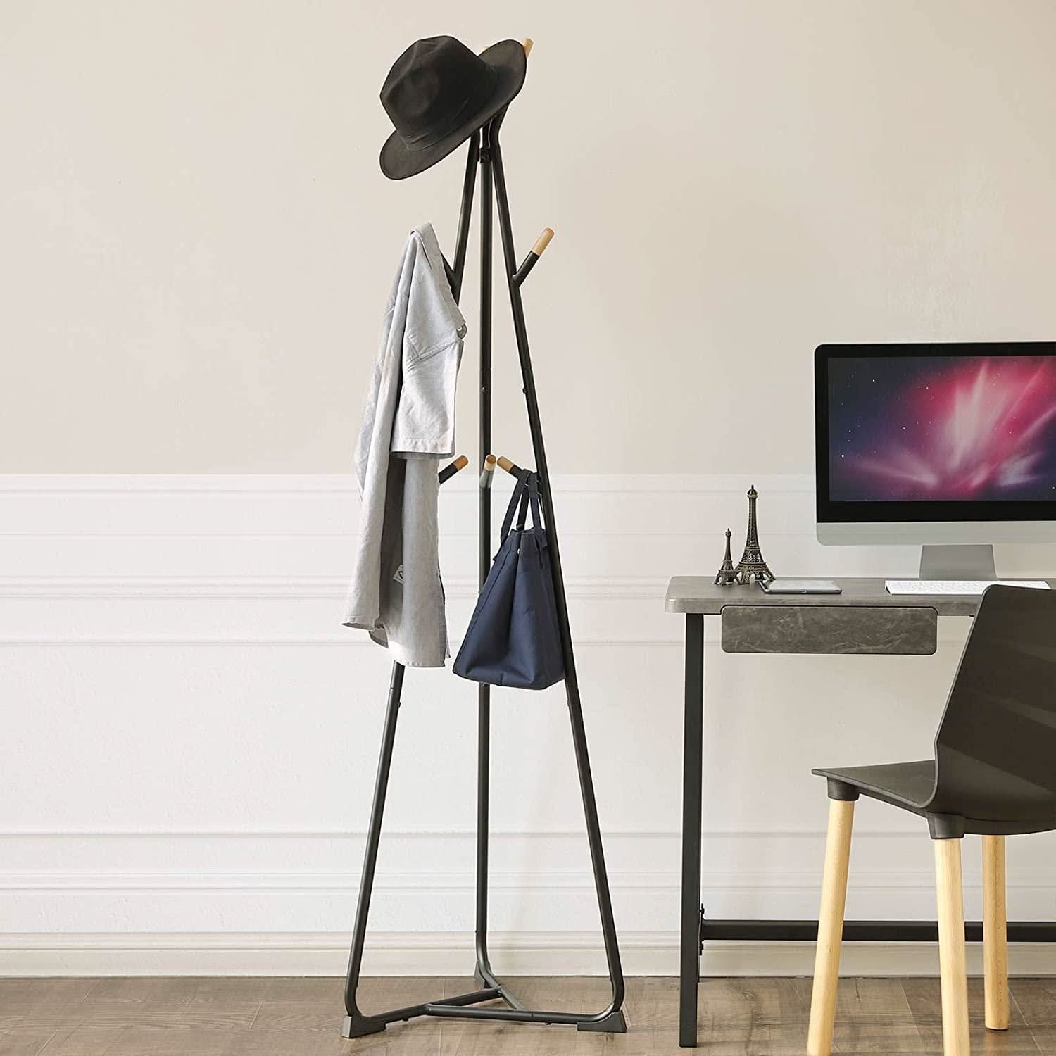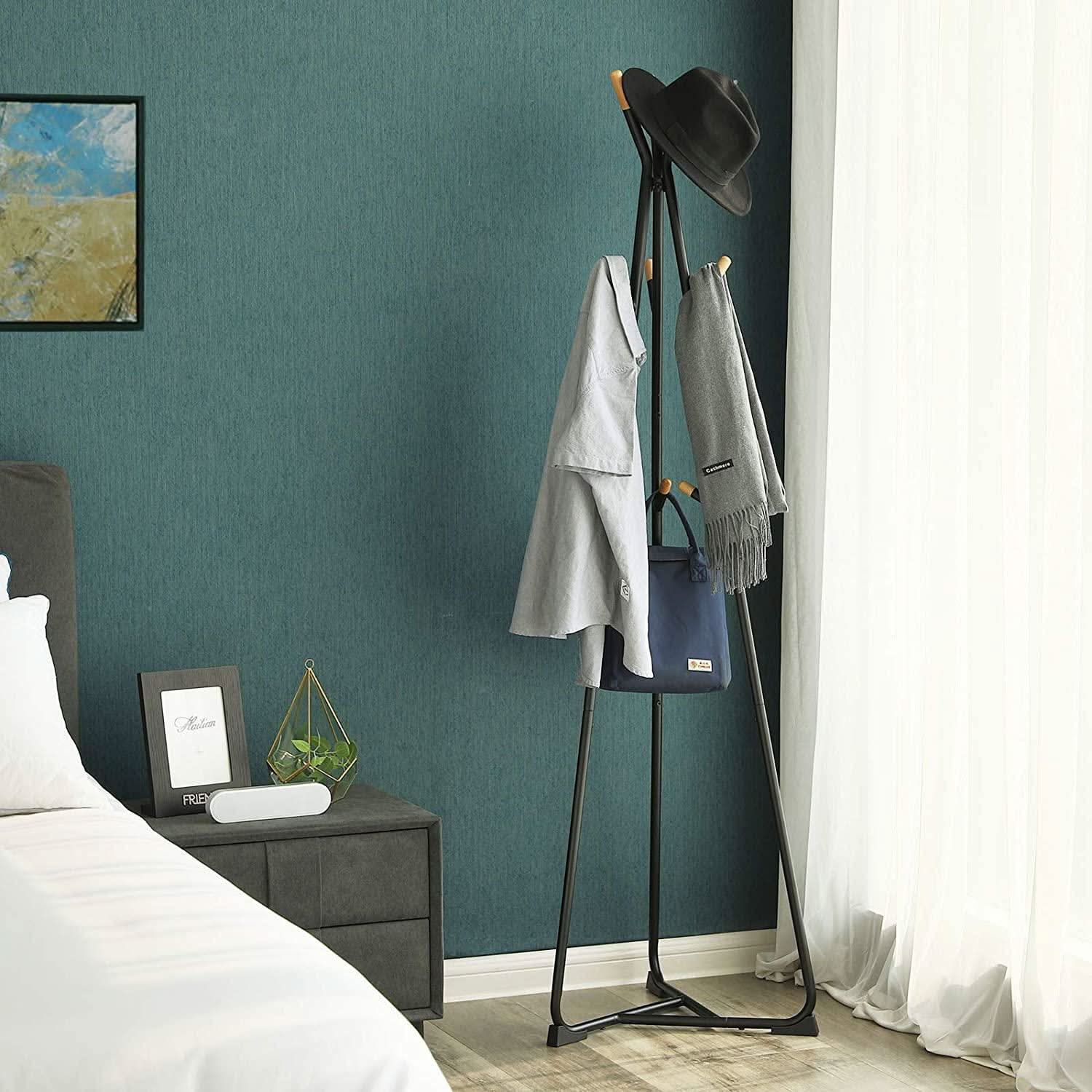 Šis vietą taupantis gaminys turi stabilų trikampį pagrindą, kuris užtikrina, kad esant papildomai apkrovai gaminys nepasvirs. Be to, gaminyje yra 9 apvalūs buko kabliukai, skirti paltams, striukėms, krepšiams arba šalikams ir kepurėms laikyti.