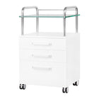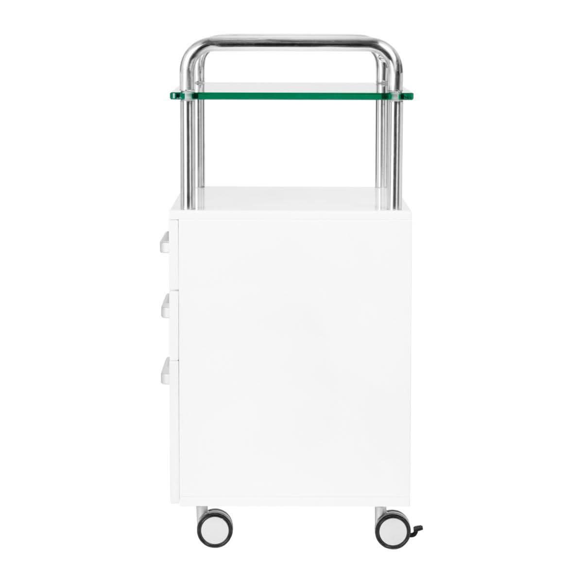 Kokybiškas podologijos vežimėlis – tai funkcionalus kosmetinis baldas ant ratukų. Dėl savo mobilumo galite jį gabenti į kitas procedūrų patalpas. Vežimėlis turi stiklinį stalviršį, tris stalčius įrankiams, priedams ir lentynėlę podo frezai ar kitam įrenginiui.