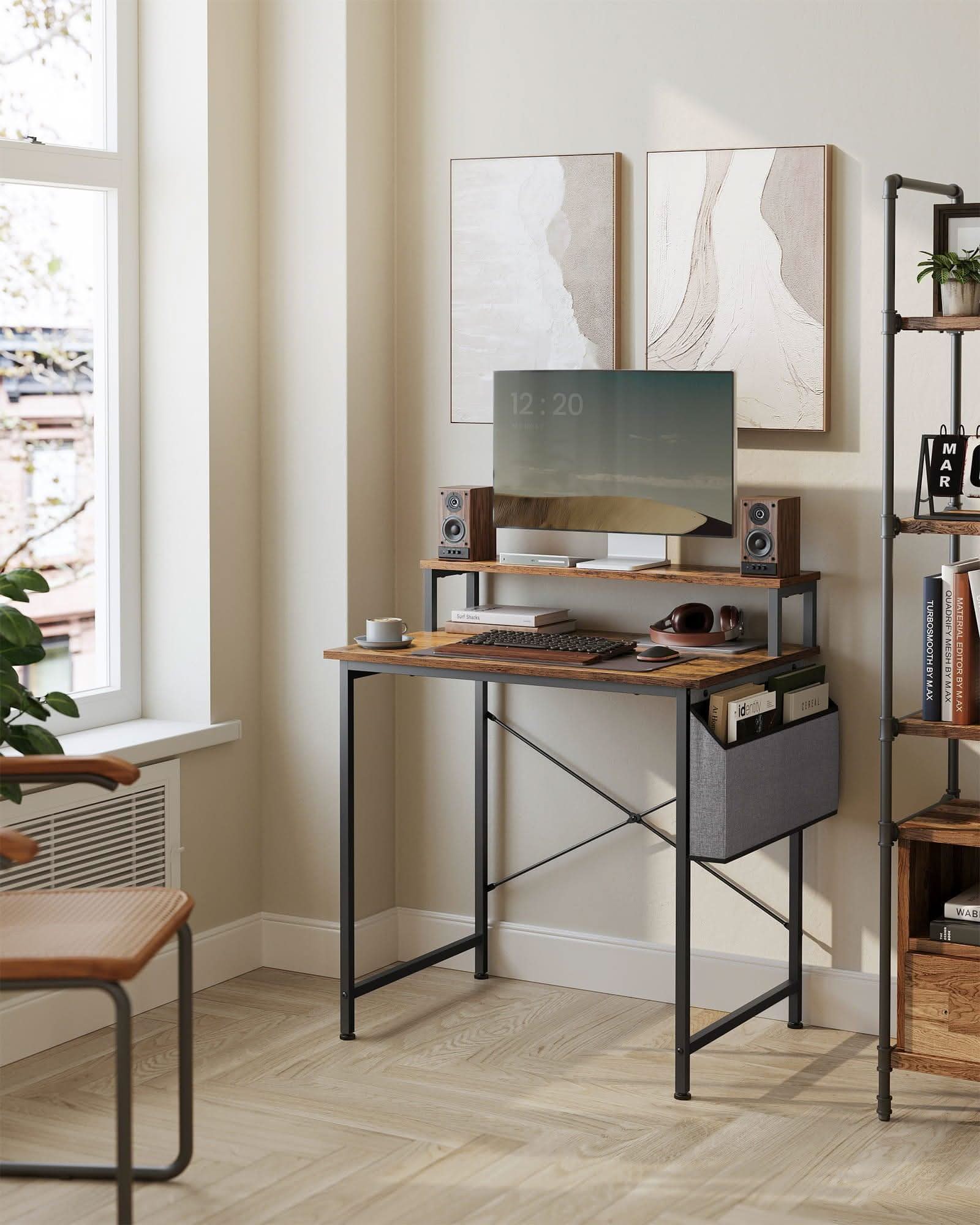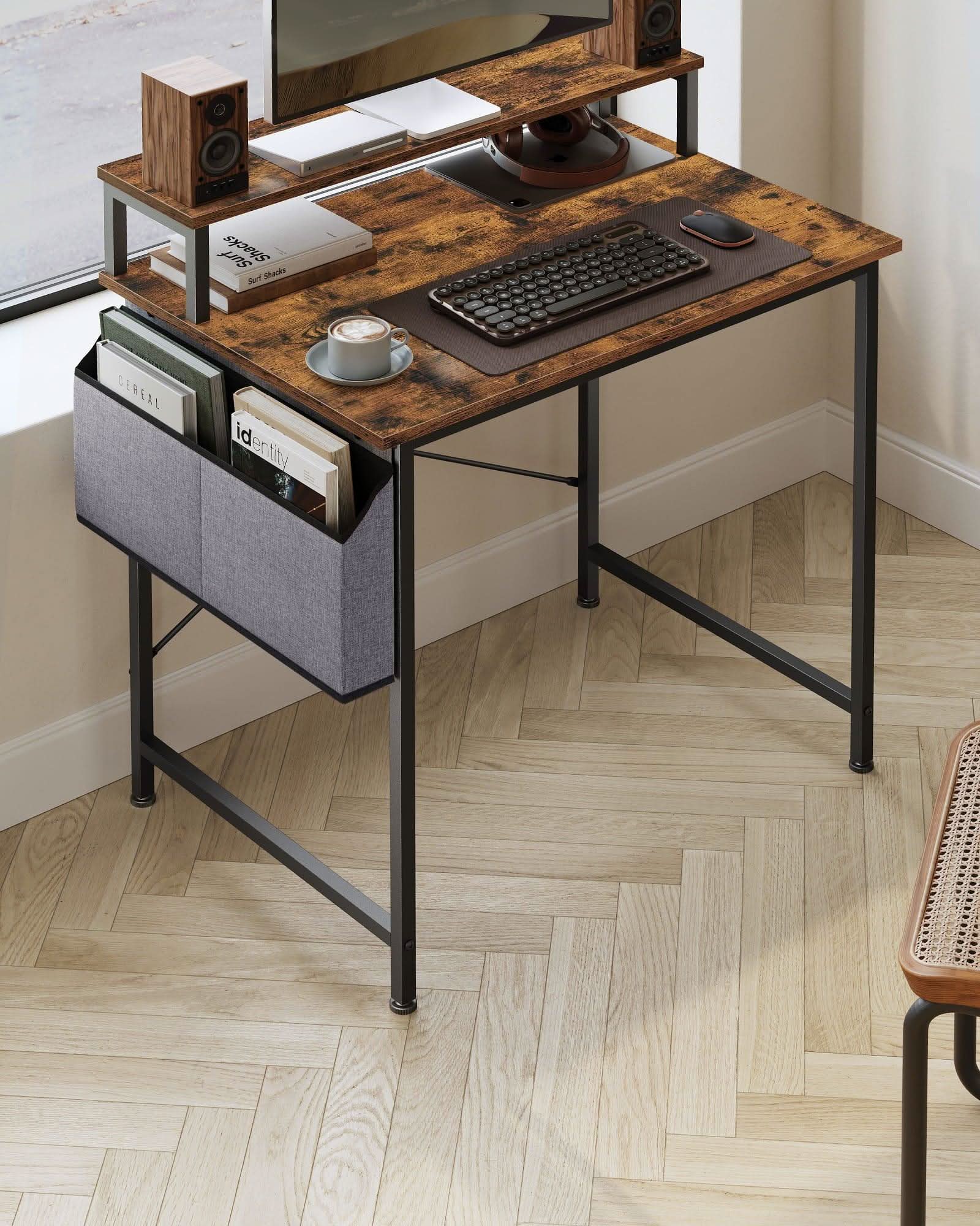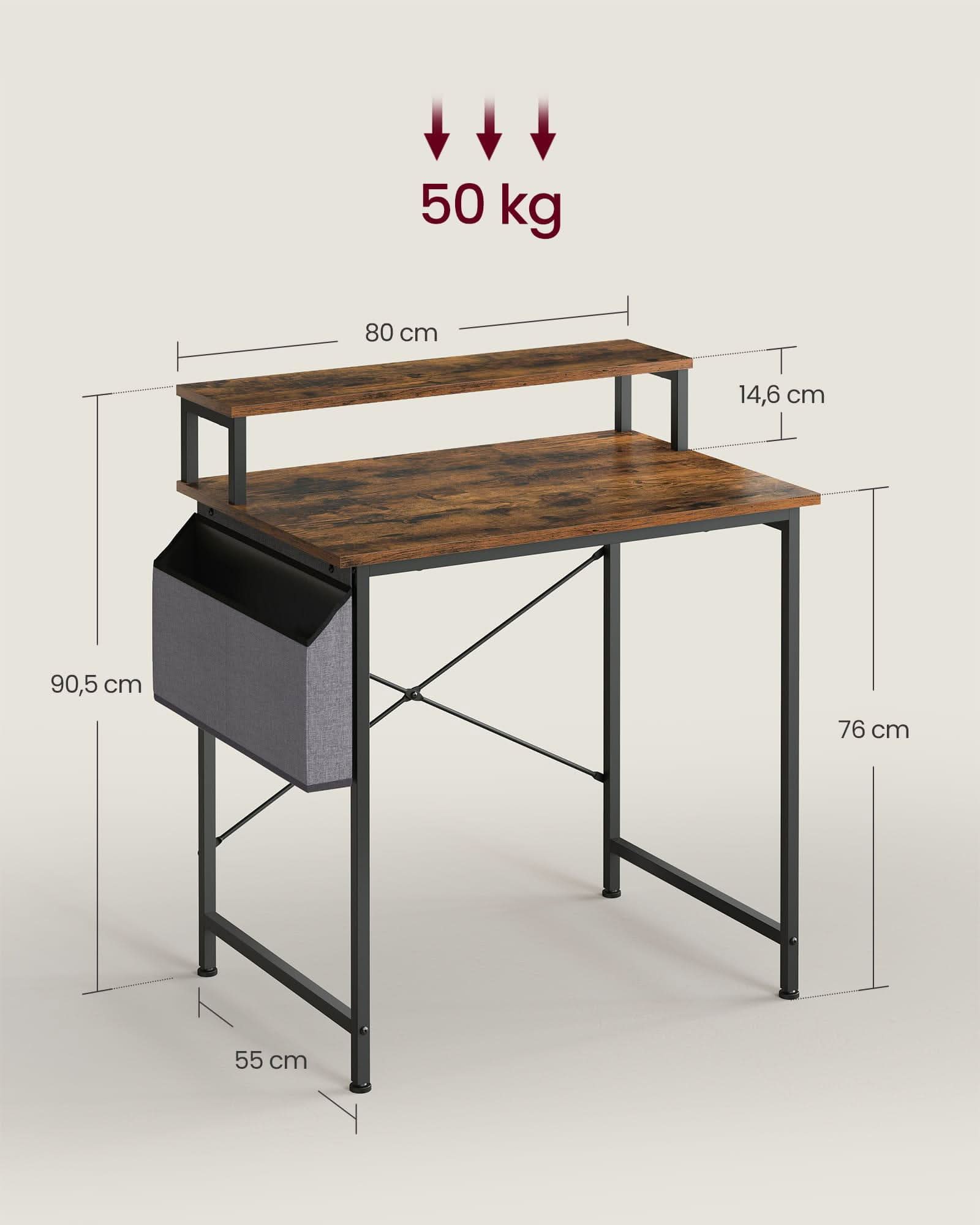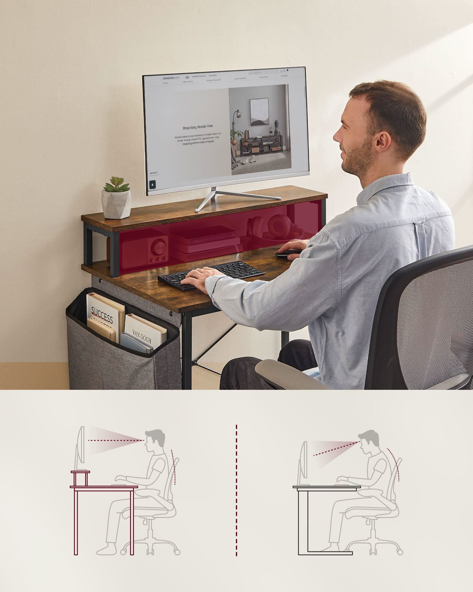 Rinkinyje yra medžiaginis krepšys, kuris gali būti tvirtinamas kairėje arba dešinėje pusėje. Atitinkamas rašomojo stalo gylis leidžia patogiai naudotis, nes čia nesunkiai sutalpinsime ergonomine kėdę ar kitą patogią kėdę.