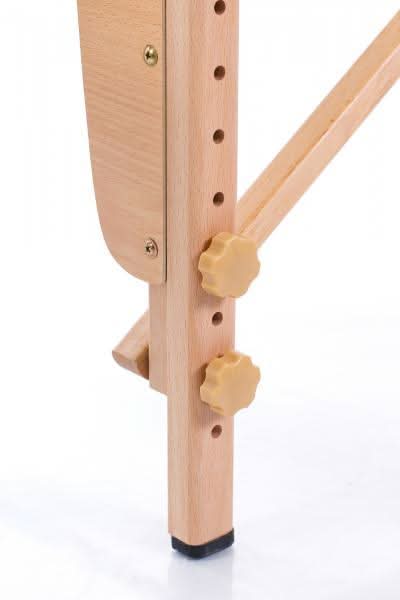 Šis pilno dydžio, profesionalus masažo stalas sukurtas taip, kad užtikrintų paprastumą, komfortą ir tvirtumą. Elegantiškas vokiško europinio buko medienos rėmas yra itin stabilus ir masažo metu nesukelia jokio girgždėjimo ar cypimo. Kojos lengvai išsilanksto, todėl stalo surinkimas yra saugus ir paprastas.