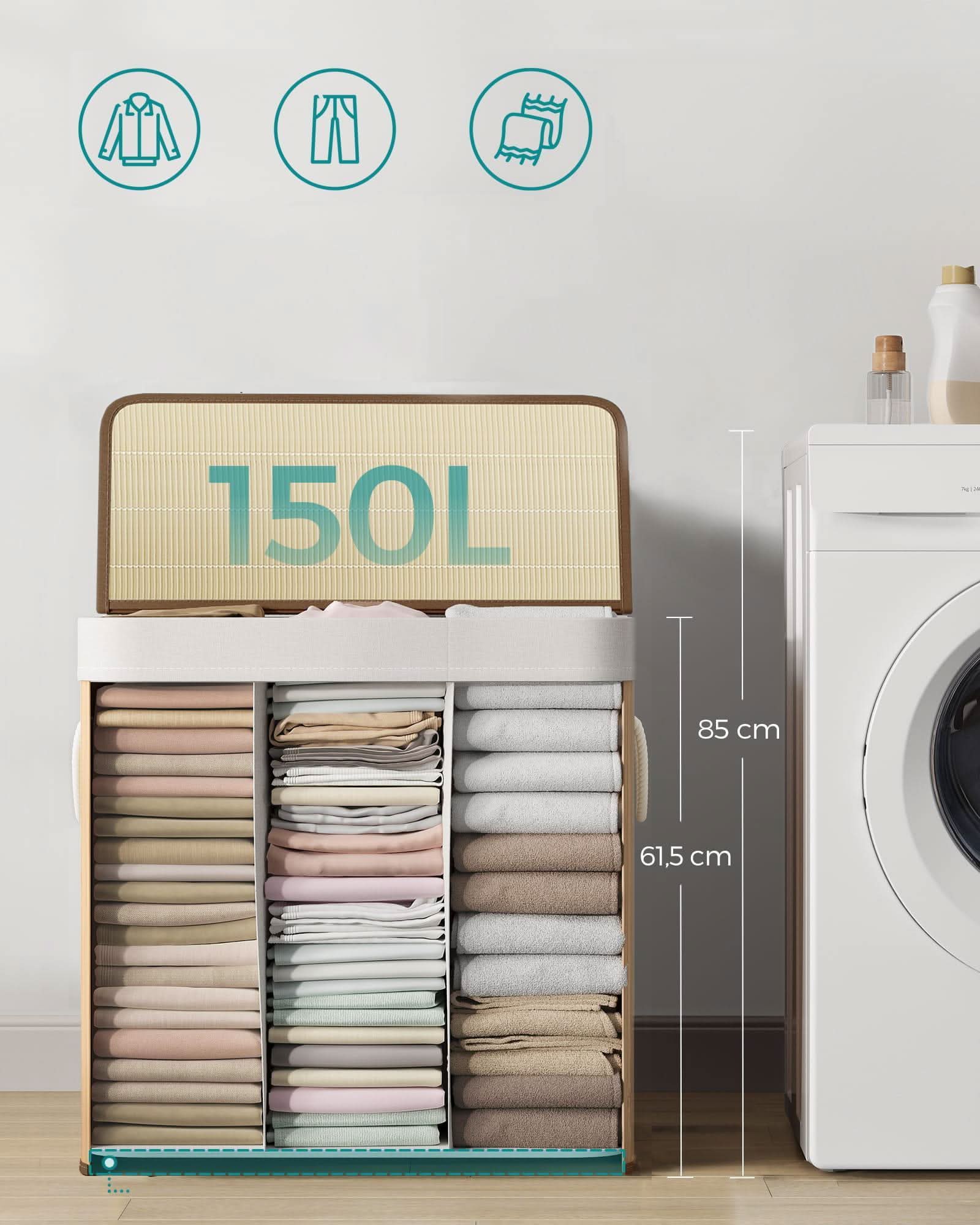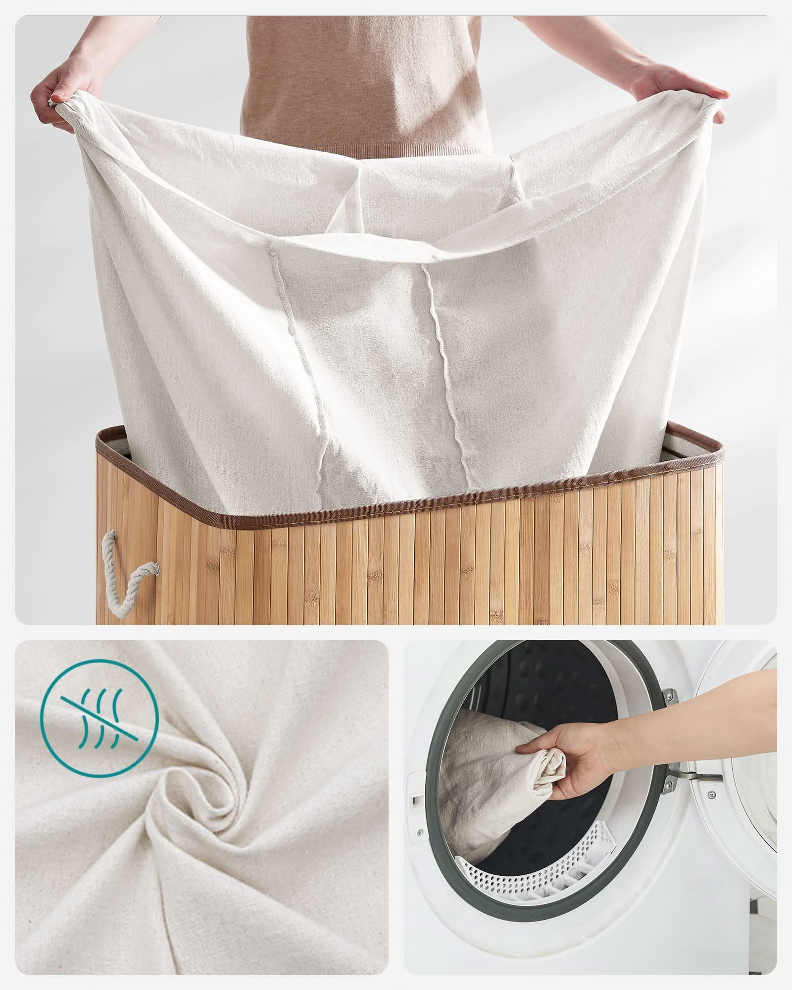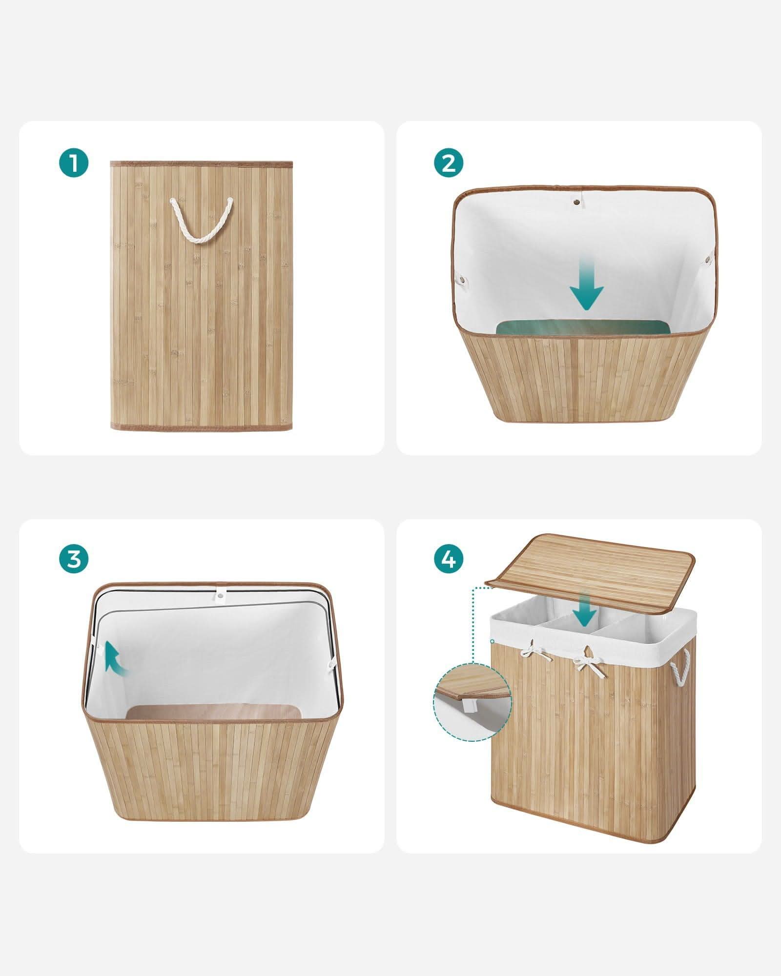 Tai yra praktiškas trijų skyrių skalbinių krepšys, kurio bendra talpa 150 L, pagaminta iš labai gražių bambuko lentjuosčių. Tinkamai parinkus medžiagas, gaminys yra atsparus galimiems pažeidimams. Krepšys yra sulankstomas. Rinkinyje yra grafinės surinkimo instrukcijos.