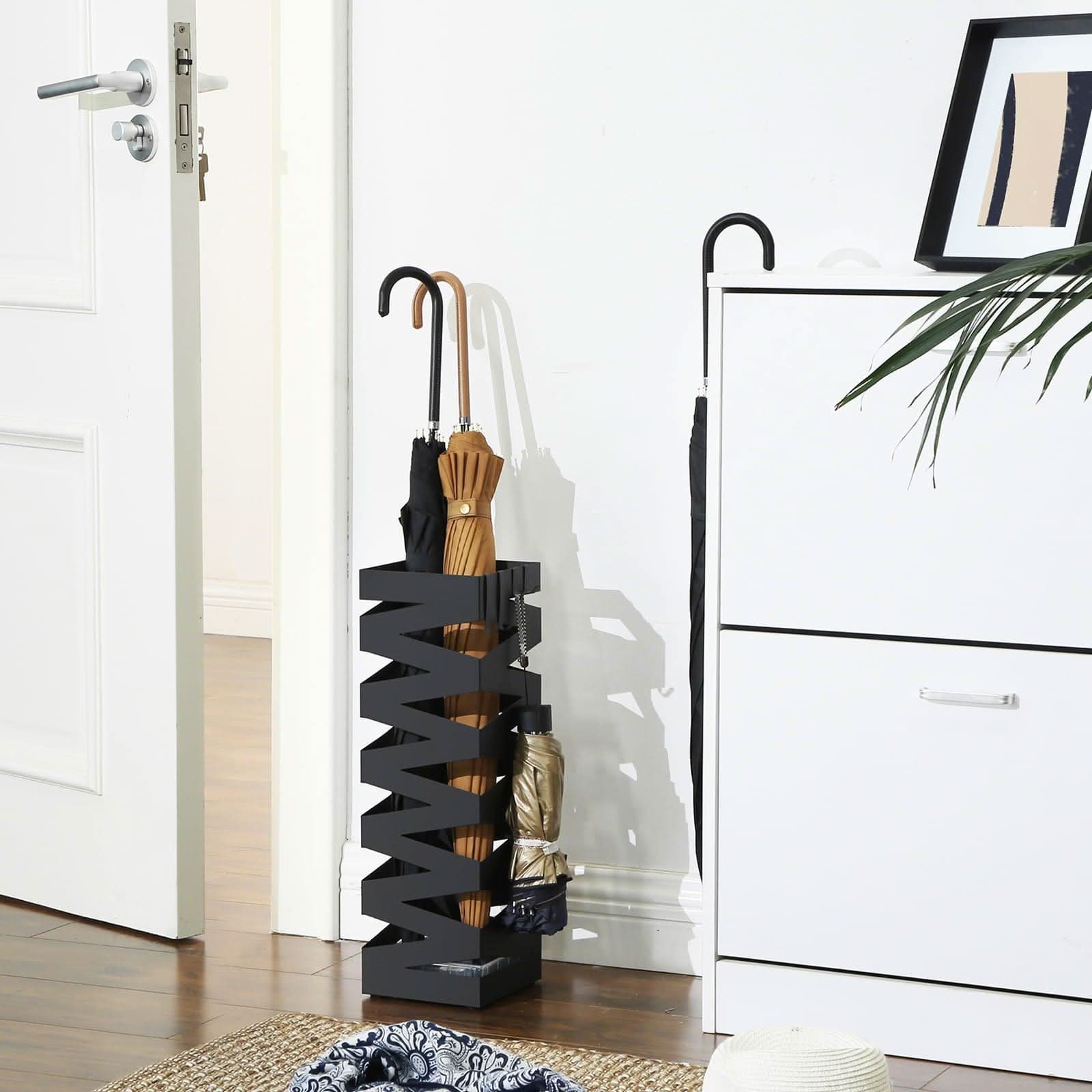 Stove bus laikomi ne tik skėčiai, bet ir kiti daiktai, pavyzdžiui, šiaurietiško ėjimo lazdos. Metalinė konstrukcija užtikrina stovo stabilumą.