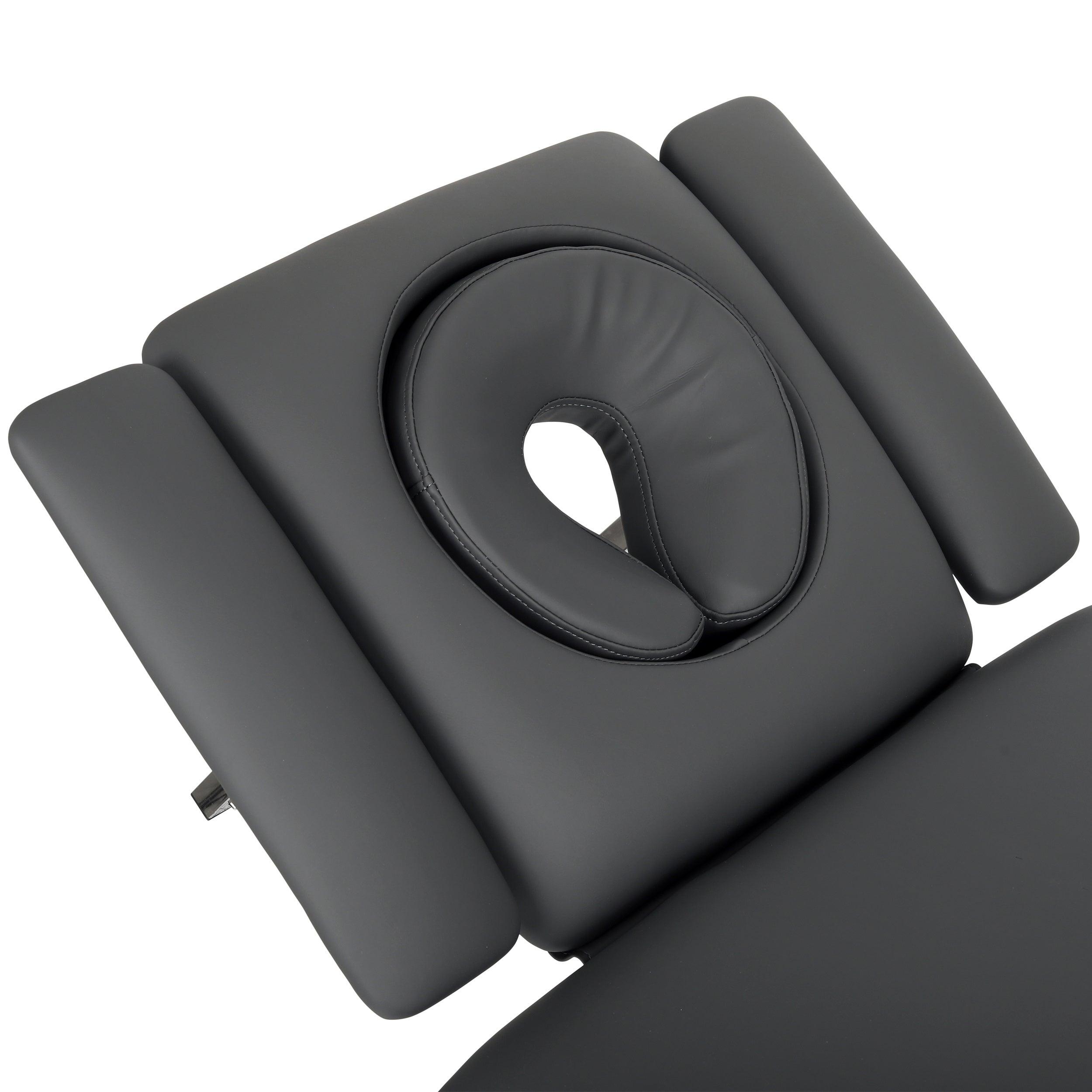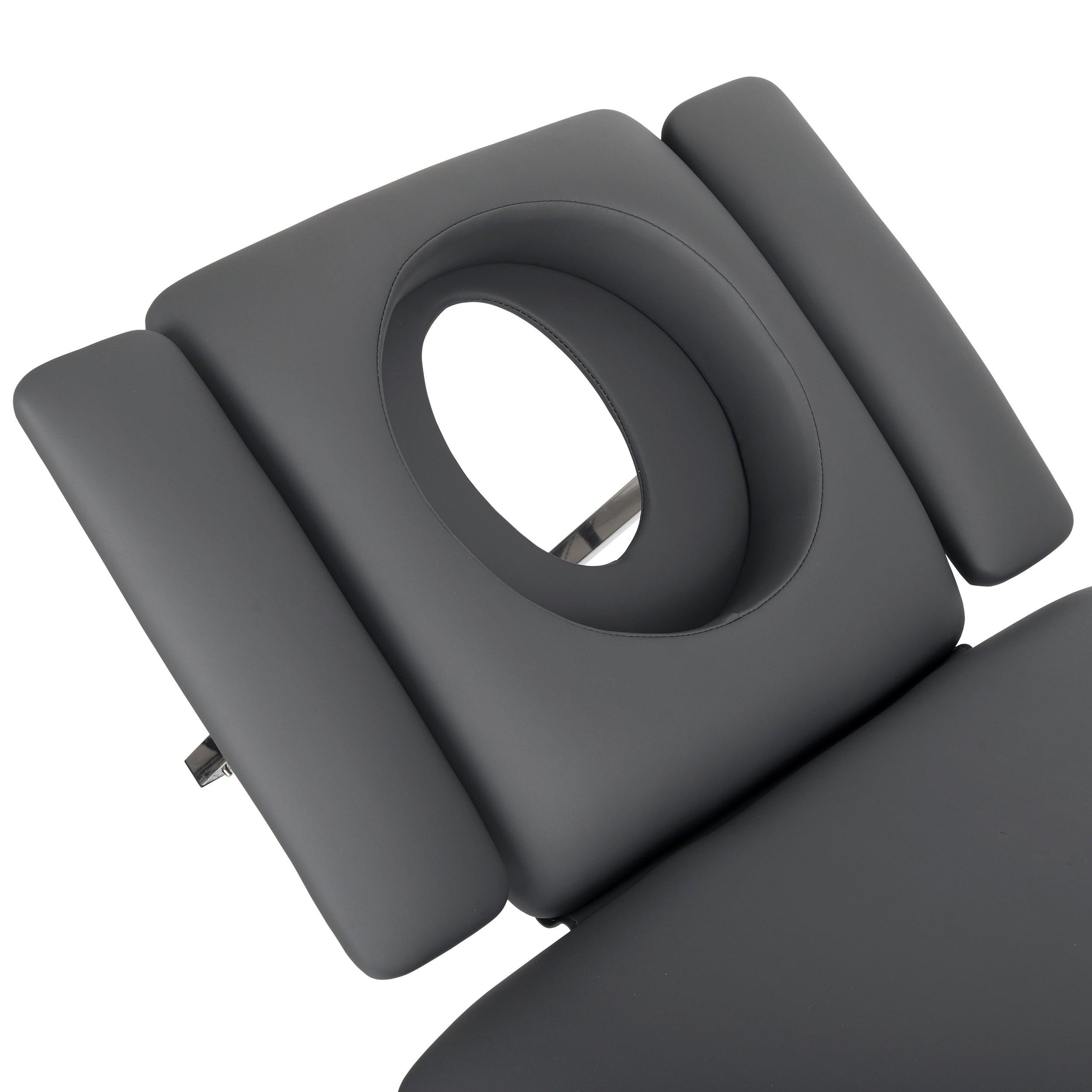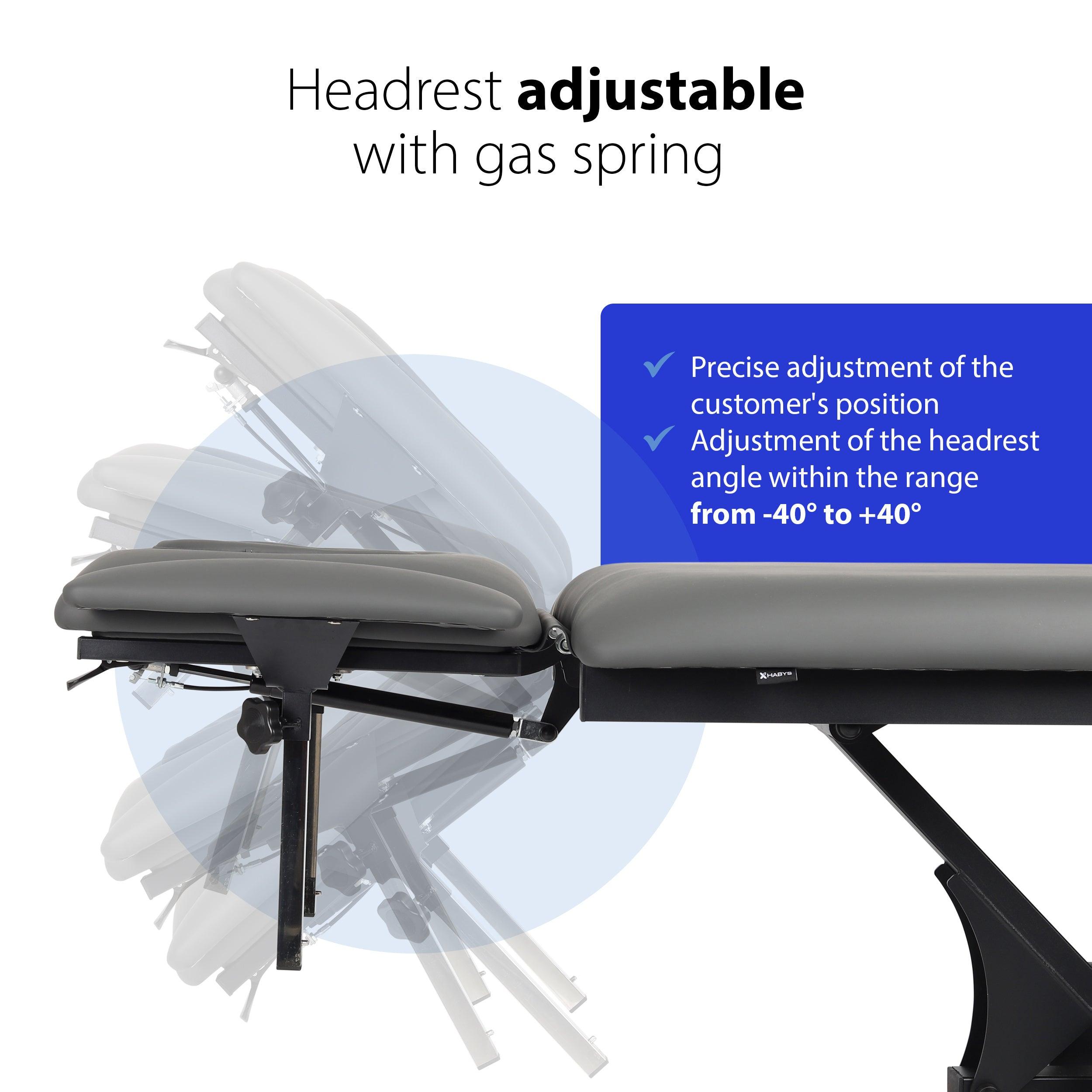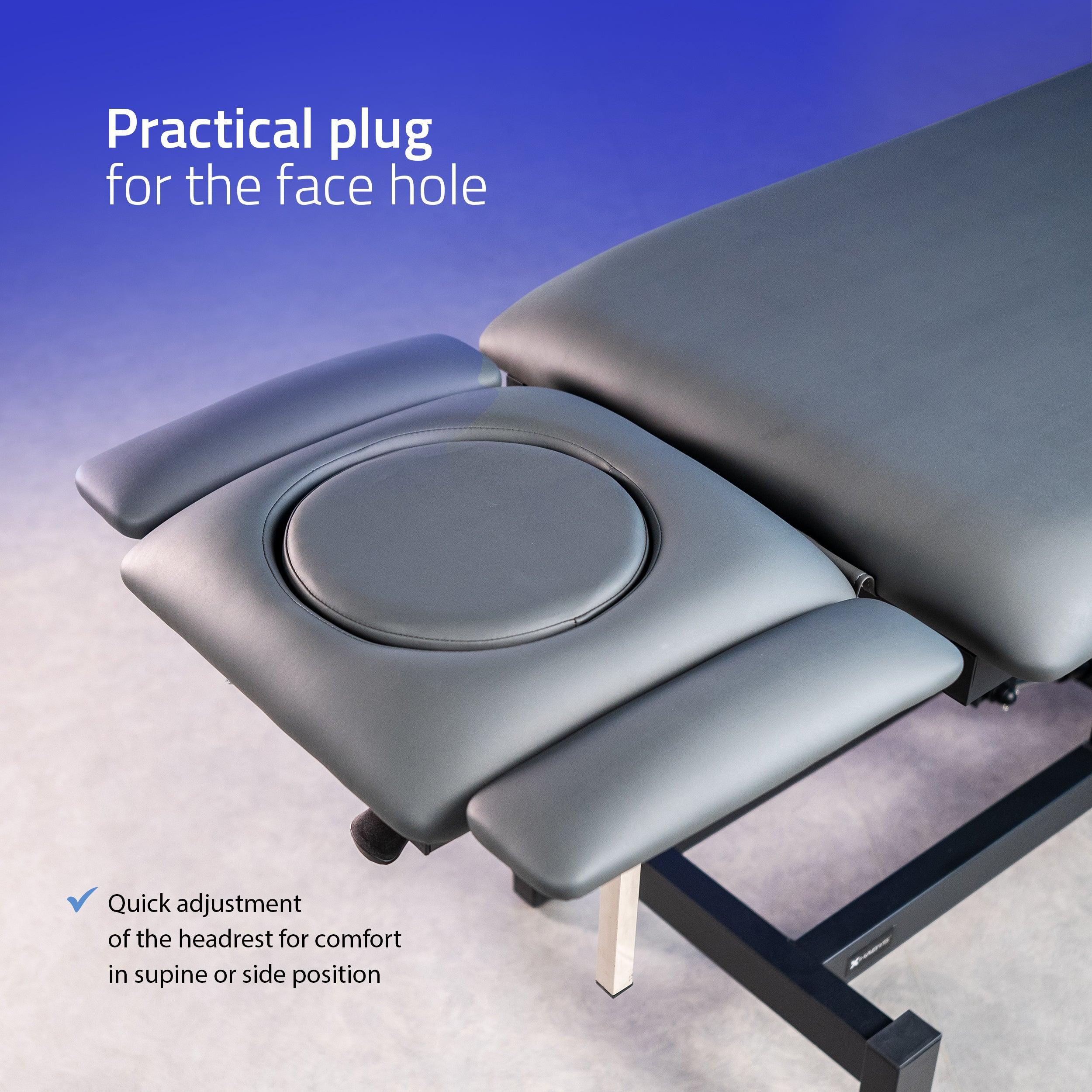 • Galvos atrama su veido anga ir užkemšamu dangteliu: Galvos atramos kampo reguliavimas leidžia pritaikyti paciento padėtį pagal terapijos poreikius. Veido angos dangtelis suteikia galimybę patogiai gulėti ant nugaros.