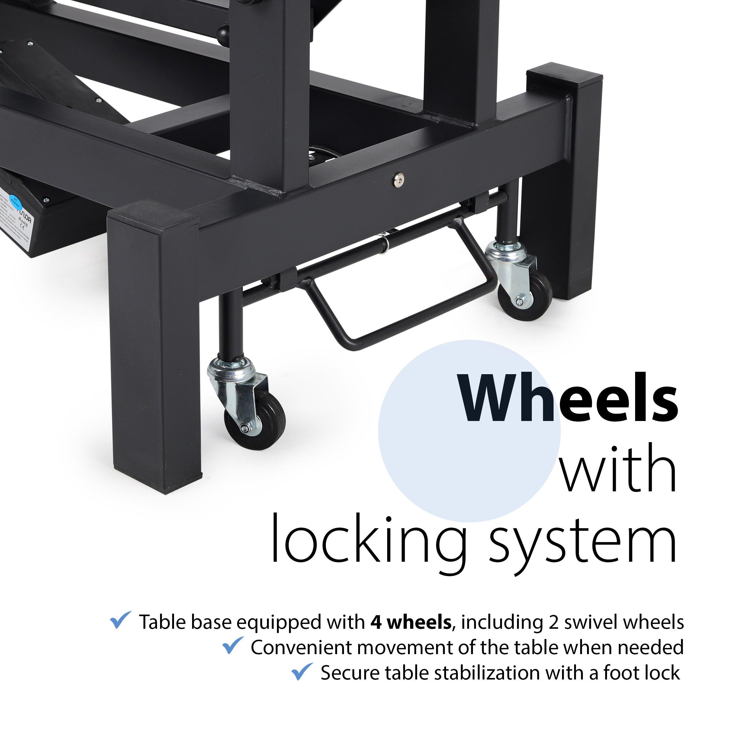 • Ratukų sistema su fiksatoriumi: Stalas turi 4 ratukus, kurie leidžia jį lengvai perstumti.
