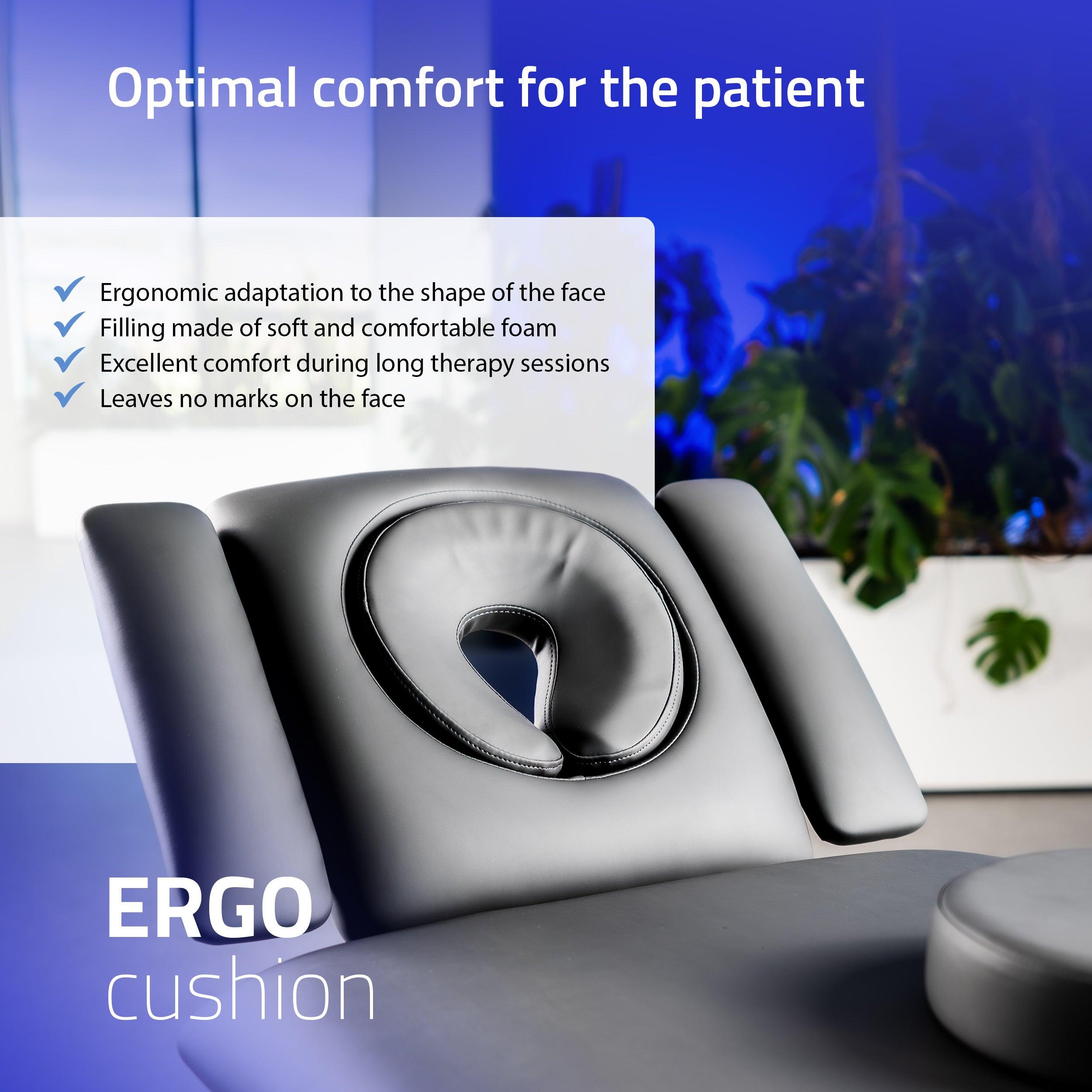 • ERGO pagalvėlė: Specialiai suformuota pagalvėlė yra minkšta, pritaikyta veido ovalui ir užtikrina puikų paciento komfortą net ilgos terapijos ar masažo metu.