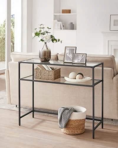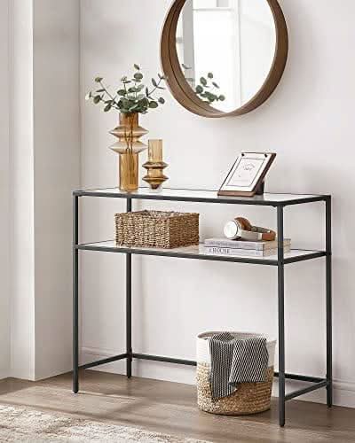 Atitinkami konsolės matmenys suteikia pakankamai vietos mūsų daiktams. Šiuolaikiška, tačiau paprasta išvaizda - šios savybės tikrai paskatins pasirinkti šį baldą. Šis baldas pasižymi universalumu ir funkcionalumu, todėl puikiai tiks svetainėje, miegamajame, prieškambaryje ar namų biure. Konsolė tikrai derės prie daugelio kambarių interjero. Plieninė konstrukcija užtikrina baldo stabilumą. Puikiai priderinti rėmo elementai ir stiklinės lentynos suteiks žavesio jūsų interjerui.