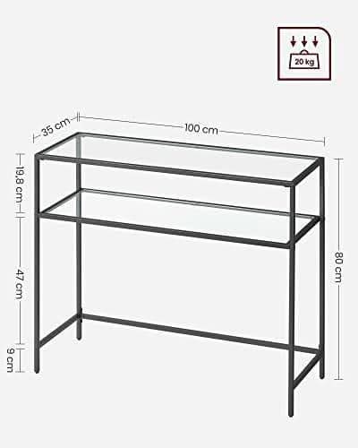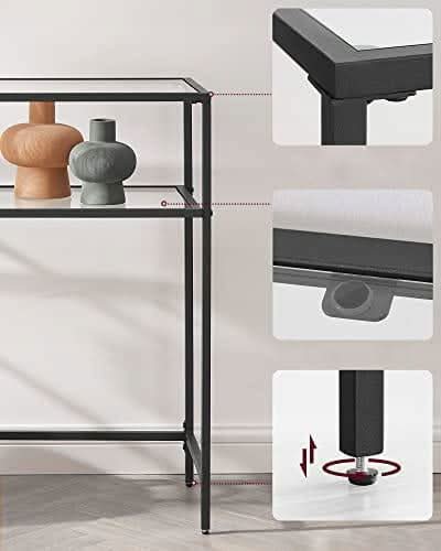 Konsolė pagaminta iš stiklo ir juodais milteliais dengto plieno. Šis gaminys sukurs nuostabią jūsų kambario puošmeną. Konsolės lentynos yra stabilios, todėl ant jų galime statyti knygas, gėles vazose, dekoratyvines figūrėles, vaikų žaislus ir nuotraukų rėmelius.