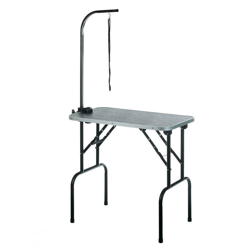 Itin stabilus stalviršis padengtas juodu neslystančiu kilimėliu. Juodas aliuminio rėmas. Stalą labai lengva surinkti, todėl jį galima naudoti mobiliam darbui su naminiais gyvūnais. Į komplektą įeina reguliuojamo aukščio pavadėlio rankena.
