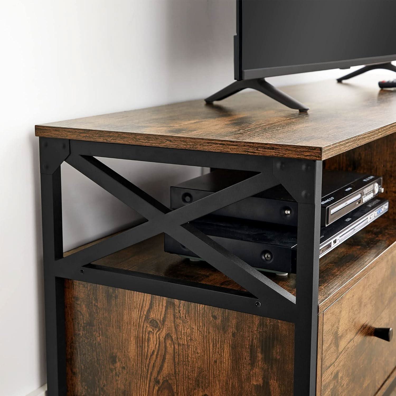 Papildomi „x“ formos sutvirtinimai ne tik padidina baldo stabilumą, bet ir neleidžia atviroje lentynoje esantiems daiktams pasislinkti į šoną. Reguliuojamos kojelės padeda tinkamai išlyginti baldą net ant šiek tiek nelygių grindų.